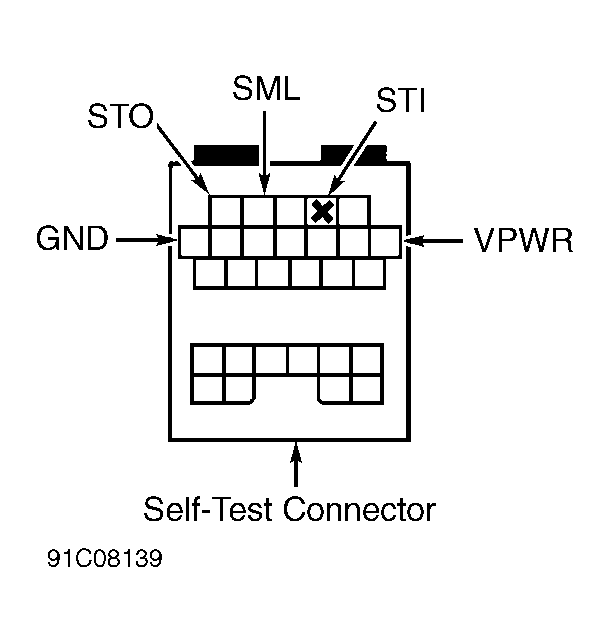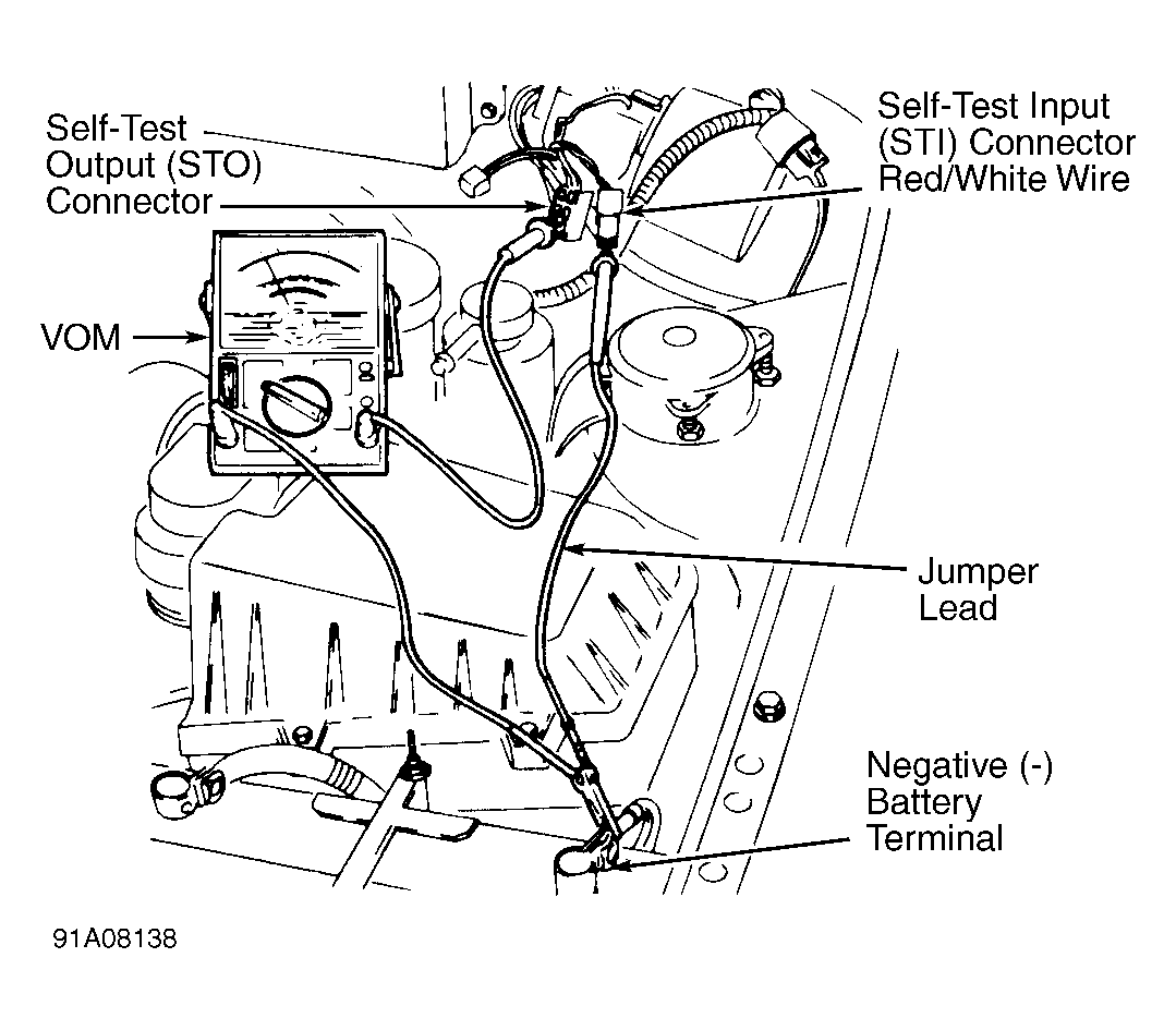1)  Connect a jumper wire between the STI connector and ground. See Figure and Figure . Turn ignition on. Observe CHECK ENGINE light. Record pulses to determine KOEO codes stored. Go to step 3).