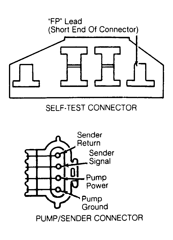 5. If fuel pressure is zero, ensure battery is fully charged and key is off. Ground fuel pump lead at SELF-TEST connector. Using a jumper lead, ground FP terminal. See Fig 1 . Ensure connection is okay at pump/sender unit. Turn key on, leaving engine off. Listen for sound of fuel pump. If pump is running, go to next step. If it is not running, go to step 7).