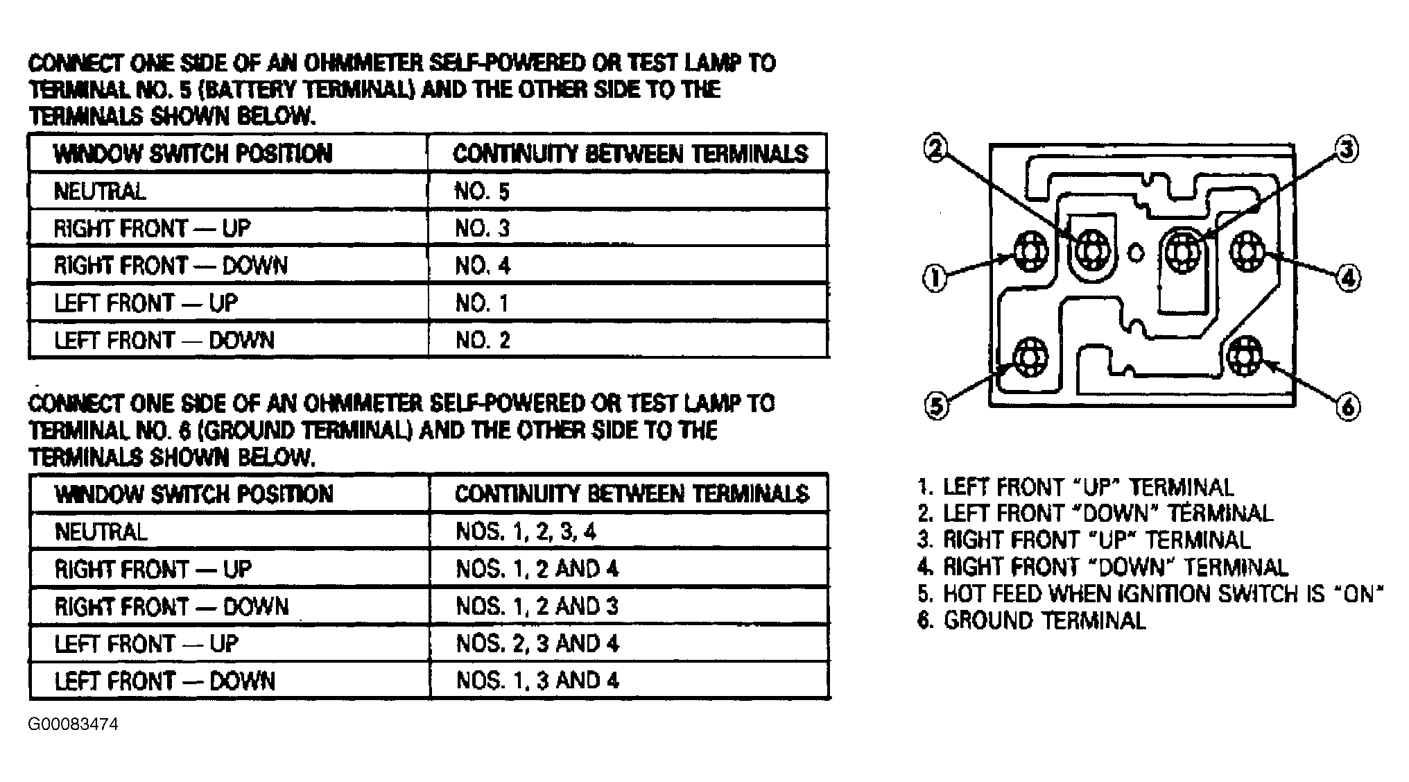 - Push both window switches downward (away from window when in installed position). Both terminals No. 2 and 4 should have no continuity to terminal No. 6. See Fig 1 . See WIRING DIAGRAMS .