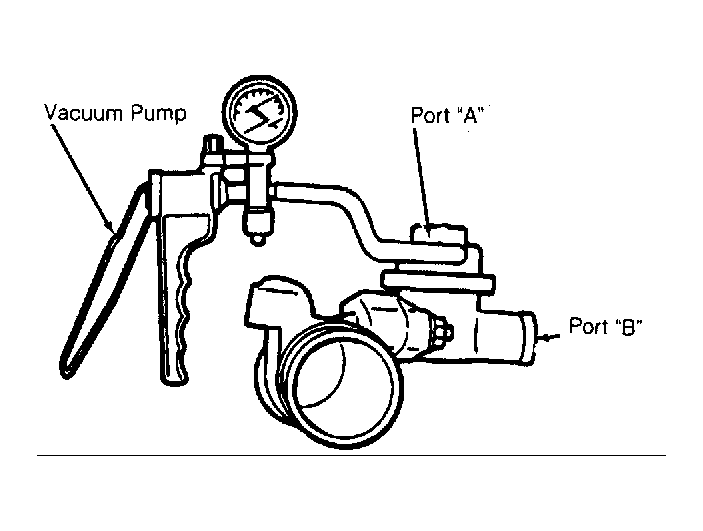 Remove compressor by-pass hose from engine. Using vacuum pump, apply 10-15 in. Hg to port "A". See Fig 1 . Air should flow through port "B". If air does not flow through port "B", replace compressor by-pass valve.
