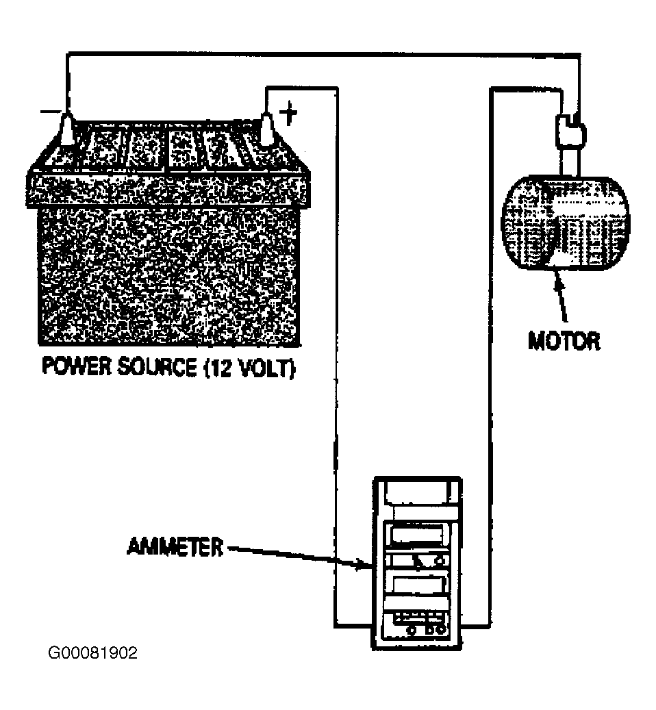 Disconnect the motor lead. Disconnect the regulator mechanism from the motor. Supply power to motor lead connector with an ammeter in series. Operate the motor and observe the current draw. The current draw for the no-load test should not exceed four amps and should not fluctuate. Reversal of the motor wire connections will reverse the direction of motor rotation. Replace the motor if the current draw exceeds 4 amps. See Fig 1 .