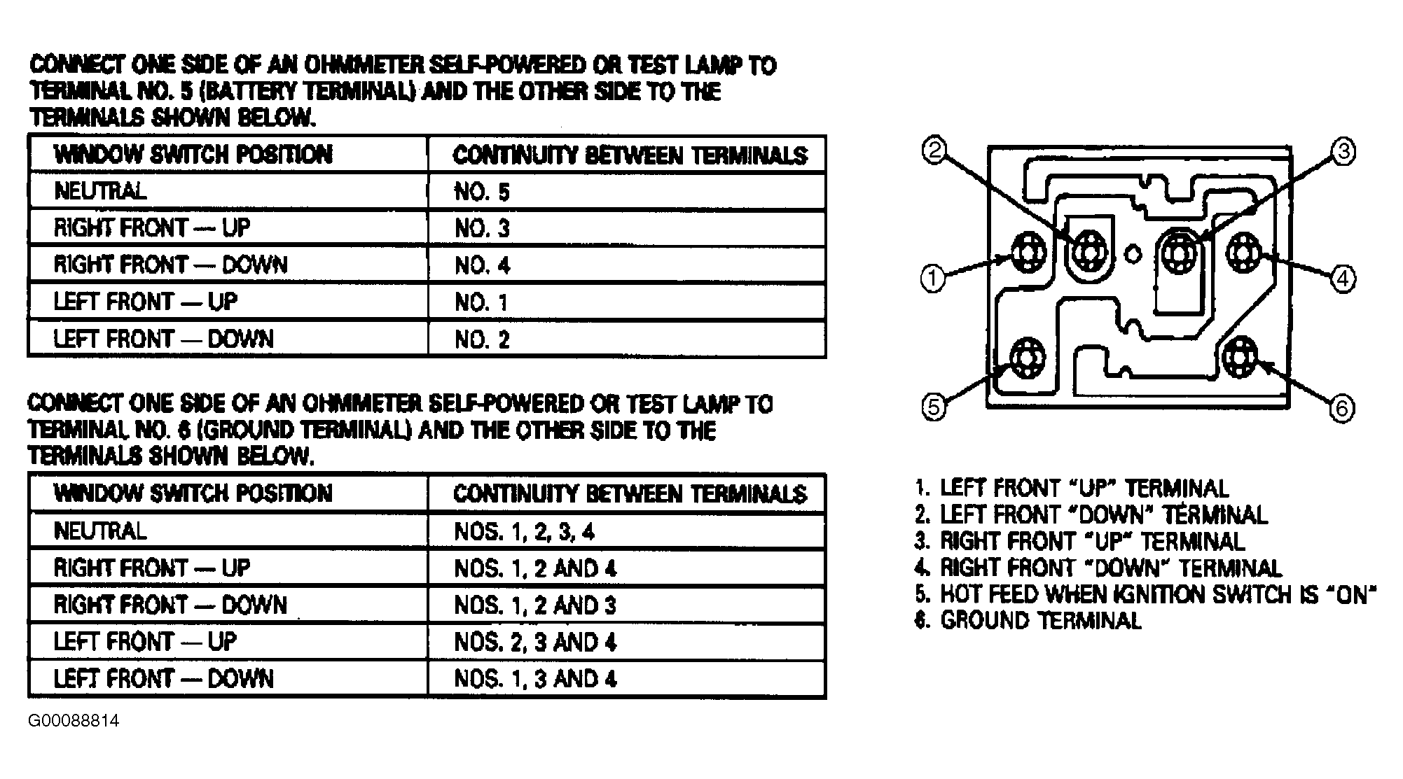 3. Remove the test lead from terminal No. 6 and connect to terminal No. 5 (hot feed terminal). With both switches in the neutral position, terminal No. 5 should have continuity only with itself. Push both window switches upward (toward the window when in installed position). Both terminals No. 1 and 3 should have continuity to terminal No. 5.