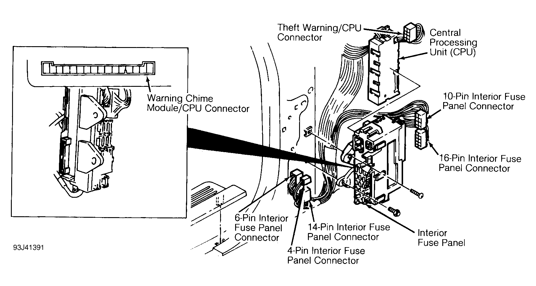- Turn ignition off. Locate and disconnect 16-pin interior fuse panel connector. See Fig 1 . Disconnect main power window switch connector and passenger's power window switch connector. Measure resistance between Black/Red wire at 16-pin interior fuse panel connector and ground. If resistance is less than 5 ohms, repair Black/Red wire between power window switches and interior fuse panel. If resistance is not less than 5 ohms, go to step 4).