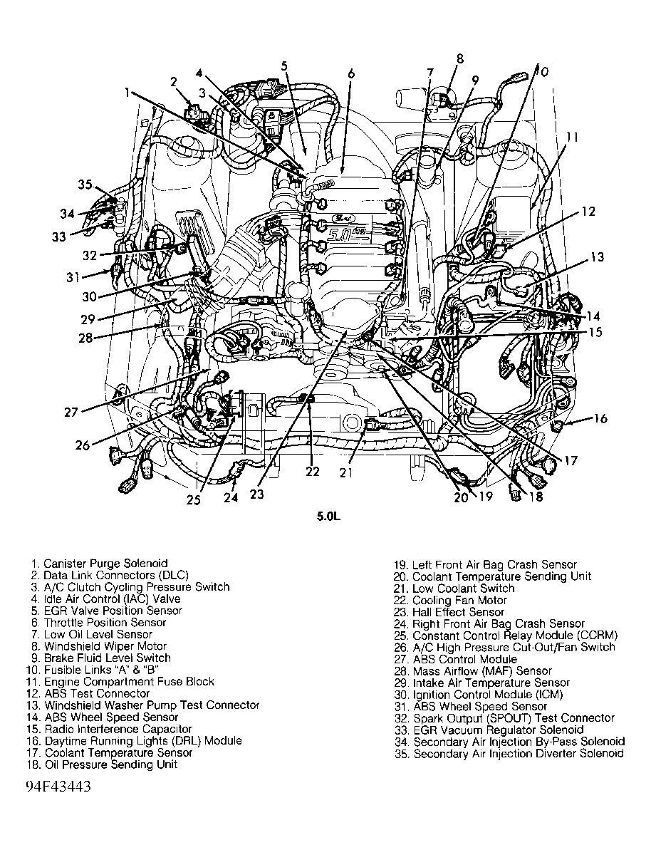 | 5.0L | In left front corner of engine bay, below horns. See Figure . | |