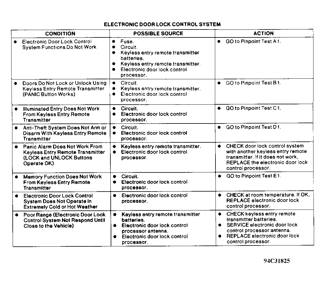 Home >> Ford >> 1995 >> Probe Base, Automatic >> Repair and Diagnosis >> Body & Frame >> Door Locks >> Keyless Entry System >> Testing >> Pinpoint Test E - Memory Function Does Not Operate From Remote Transmitter