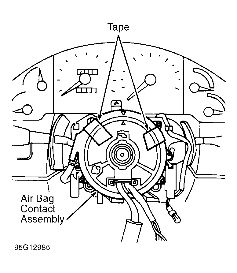 Clockspring will be damaged if steering shaft is allowed to rotate after steering shaft has been disconnected from intermediate shaft. When disconnecting steering shaft from intermediate shaft, wire steering shaft to column to prevent clockspring damage. If reusing original contact assembly, tape clockspring rotor in stationary position before removing contact assembly from steering column. See Fig 1 .