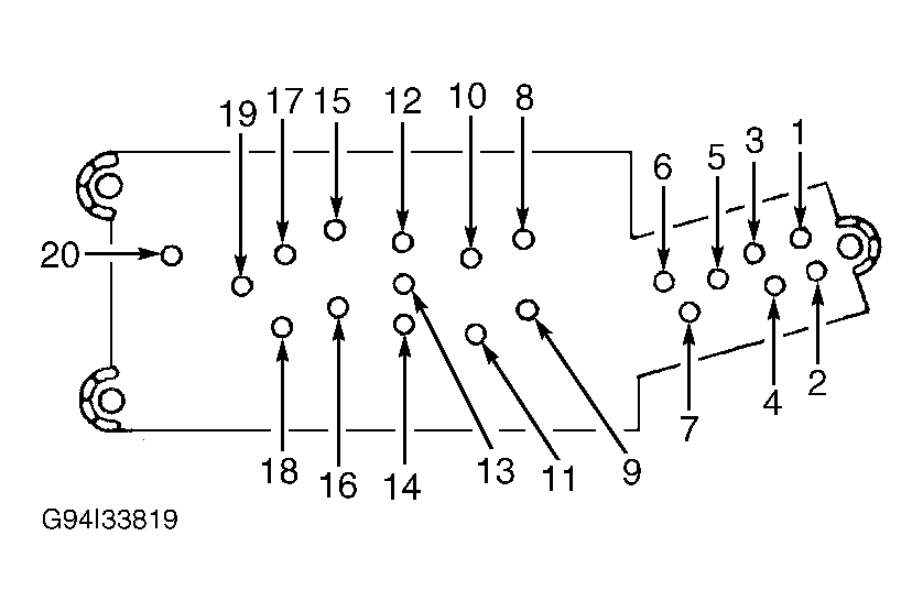 - Remove master switch from vehicle. Test using self-powered test light or ohmmeter. Replace window control switch if continuity is not as specified in testing. With switch in neutral position, continuity should be present between terminals No. 2, 8, 9, 10, 11, 15, 16, 17 and 18 and between 19 and 20. See Fig 1 .