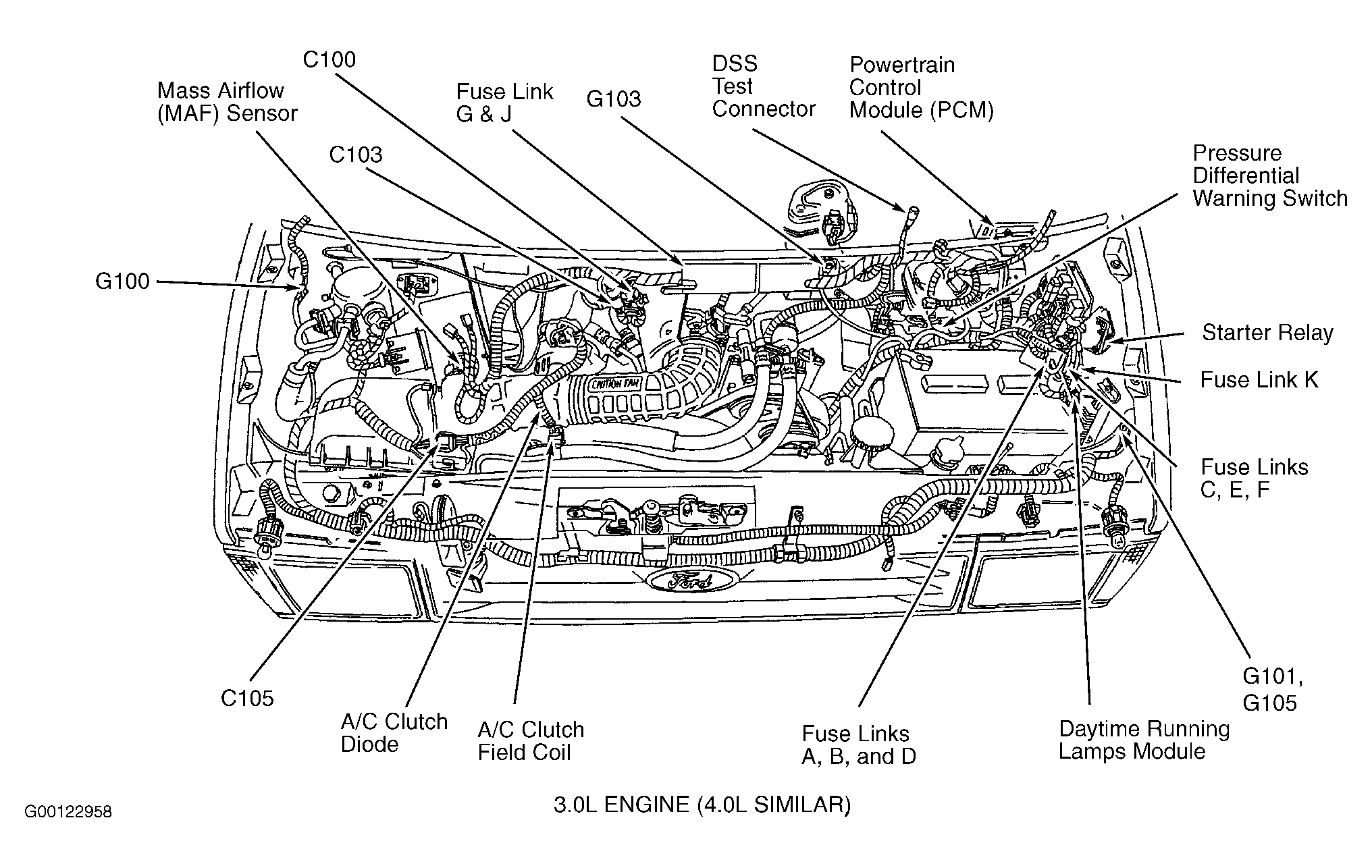 | Fuse Link "G" & "J" (Dark Blue) Ignition System | Right rear of engine compartment, taped to engine control sensor harness. See Figure . |