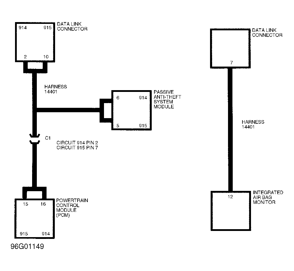- Measure resistance between Data Link Connector (DLC) pin No. 10 (Pink/Light Blue wire) and harness connector No. 1 Pink/Light Blue wire terminal. If resistance is less than 5 ohms, go to next step. If resistance is 5 ohms or more, replace circuit No. 914 (Tan/Orange wire) and circuit No. 915 (Pink/Light Blue wire).