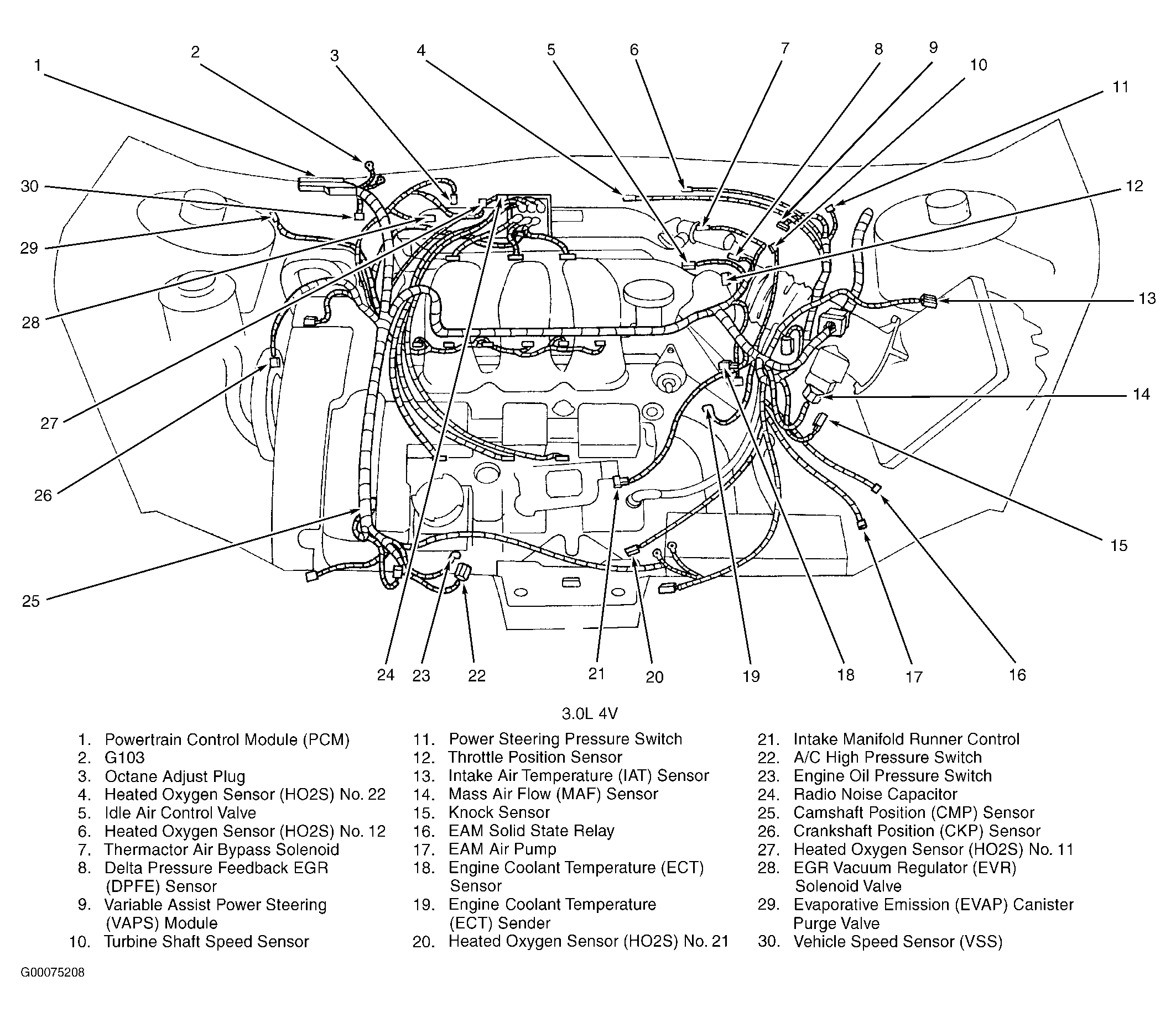 Powertrain Control Module (PCM) (3.0L 4V) Right rear corner of engine compartment, mounted in firewall. See Figure .