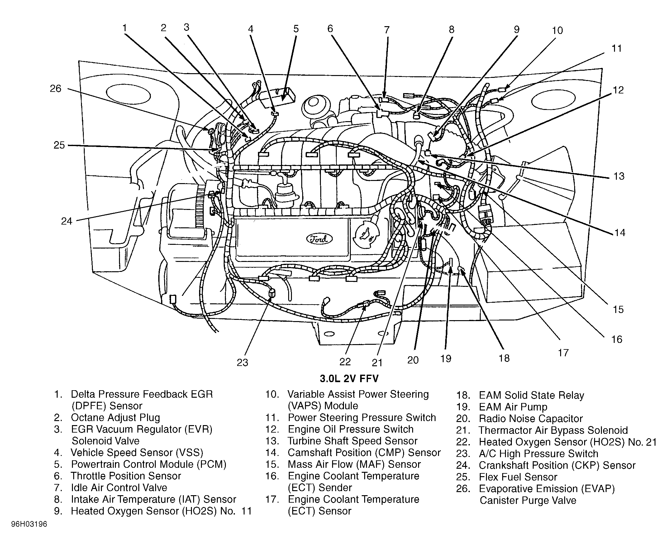 Variable Assist Power Steering (VAPS) Module (3.0L 2V FFV) Left rear of engine compartment, behind transmission fill tube. See Figure .