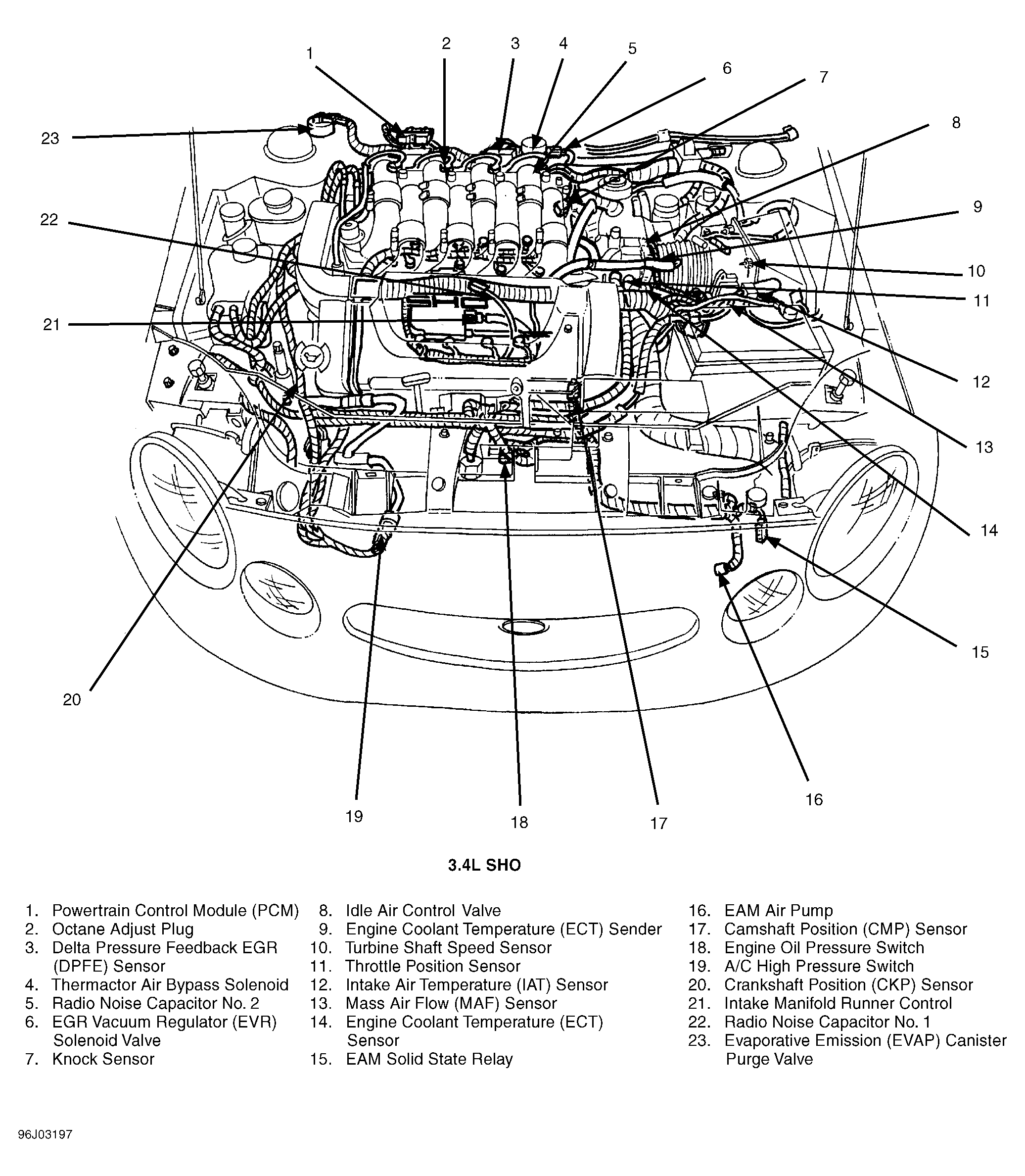 Powertrain Control Module (PCM) (3.4L SHO) Right rear corner of engine compartment, mounted in firewall. See Figure .