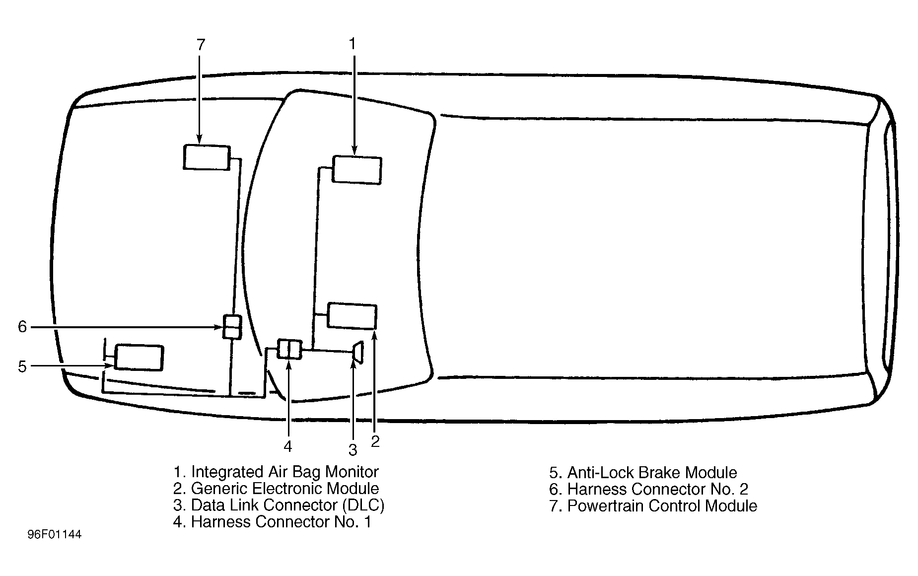 8. Disconnect Integrated Air Bag Monitor (IABM) wiring harness connector. See Figure and Figure . Turn ignition to RUN position. Measure voltage between DLC pins No. 4 and 7. If battery voltage is present, and steady, repair Light Blue/White wire short to power. If voltage is not as specified, go to next step.