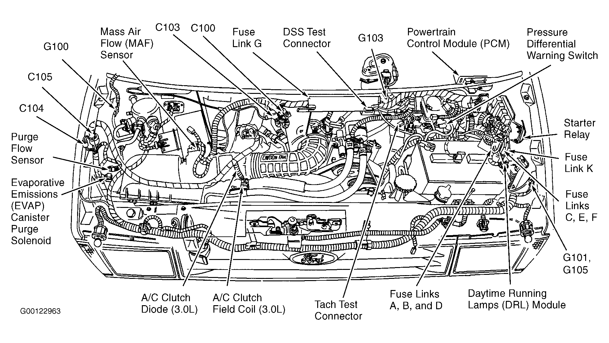 | Fuse Link "G" (Dark Blue) Ignition System | Right rear of engine compartment, taped to engine control sensor harness. See Figure . |
