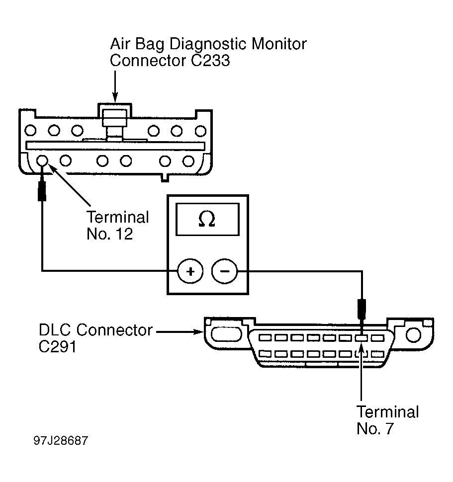 - Ensure ignition is off. Disconnect negative battery cable. Wait one minute for air bag backup power to be depleted. Disconnect air bag diagnostic monitor connector C233 located behind right side of instrument panel. Measure resistance of Light Blue/White wire between air bag diagnostic monitor connector C233, terminal No. 12 and DLC, terminal No. 7. See Figure. If resistance is less than 5 ohms, go to next step. If resistance is more than 5 ohms, repair open in Light Blue/White wire between air bag diagnostic monitor connector and DLC and retest system.