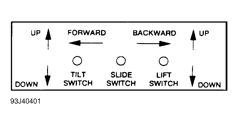 Disconnect power seat motor connectors (lift motor, slide motor and tilt motor). Ensure power seat switch is connected. Turn ignition on. Using a voltmeter, measure voltage at indicated connector terminals, with power seat switch in appropriate position. See POWER SEAT SWITCH TEST SPECIFICATIONS TABLE. See Fig 1 . If any voltage is not as specified, replace power seat switch.