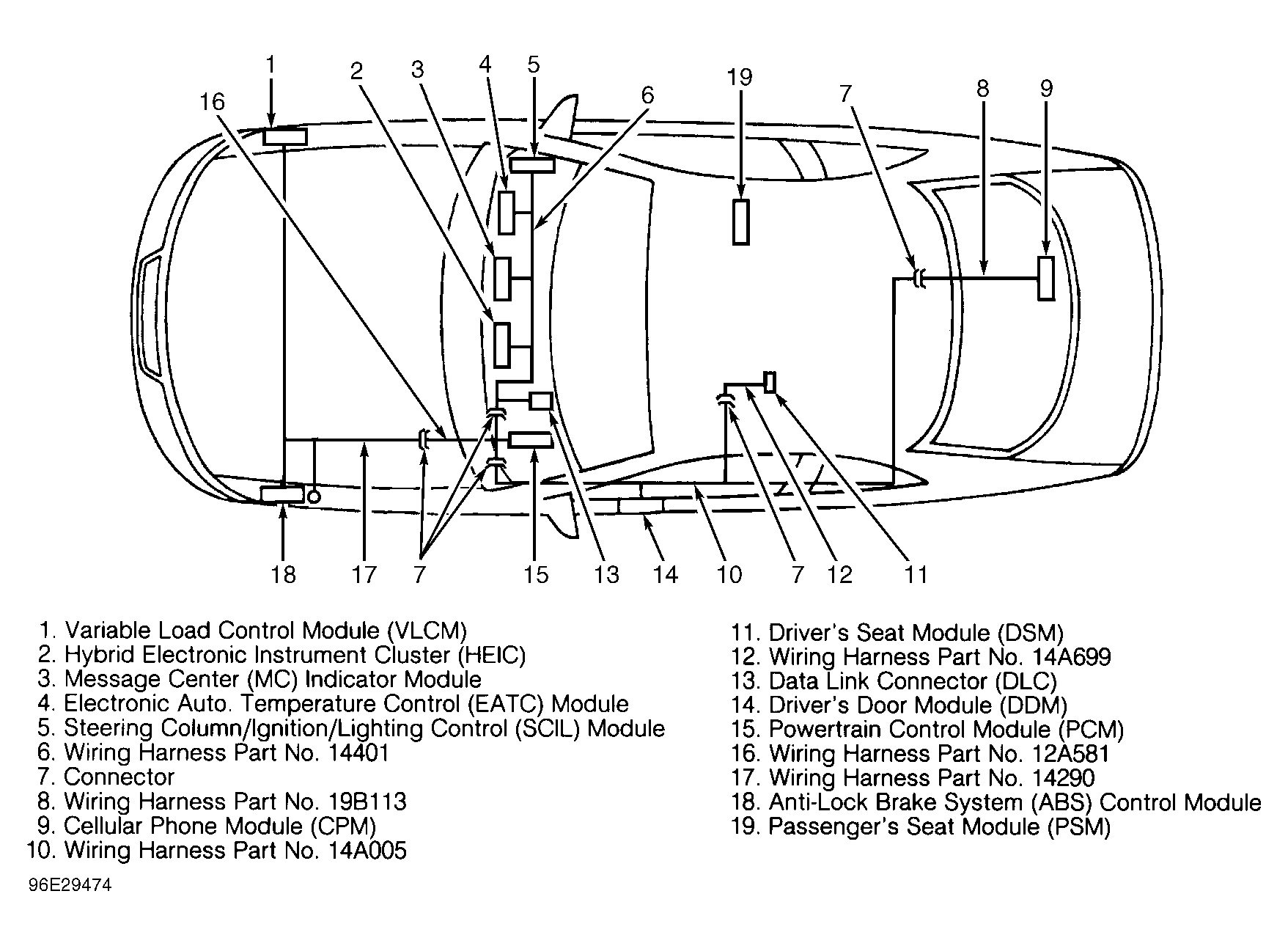 The module communications network provides the ability for a module-to-module communication by sharing inputs and outputs instead of each component having an input and output wired directly to each module. A BUS which consists of a pair of twisted wires is used to transfer information between each module. The BUS consists of a (+) circuit No. 914 and a (-) circuit No. 915. The BUS is routed throughout the vehicle to each module except the Passenger's Seat Module (PSM). See Fig 1