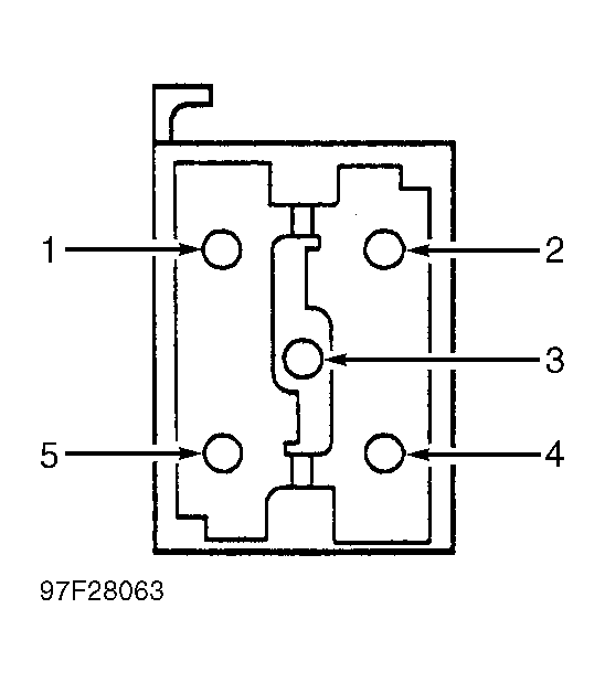 Disconnect and remove power door lock switch. See DOOR LOCK SWITCH  under REMOVAL & INSTALLATION. With switch "U" button depressed, measure resistance between switch terminals No. 2 and 3. See Fig 1 . Resistance should be less than 5 ohms. With switch "L" button depressed, measure resistance between switch terminals No. 3 and 5. Resistance should be less than 5 ohms. If resistances are not as specified, replace switch.
