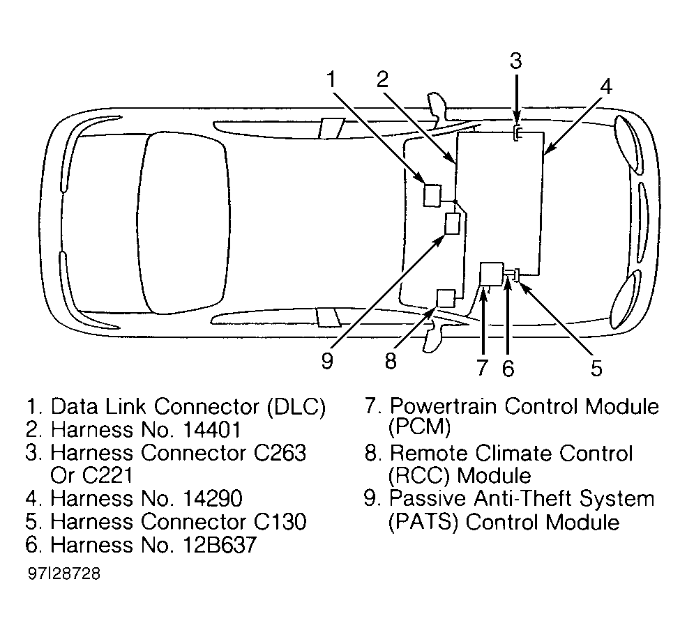 The Powertrain Control Module (PCM), Passive Anti-Theft System (PATS) module and Remote Climate Control (RCC) module are connected to the J1850 module communication network. The modules on the J1850 network can communicate with any other module on the network or a scan tool connected to Data Link Connector (DLC).