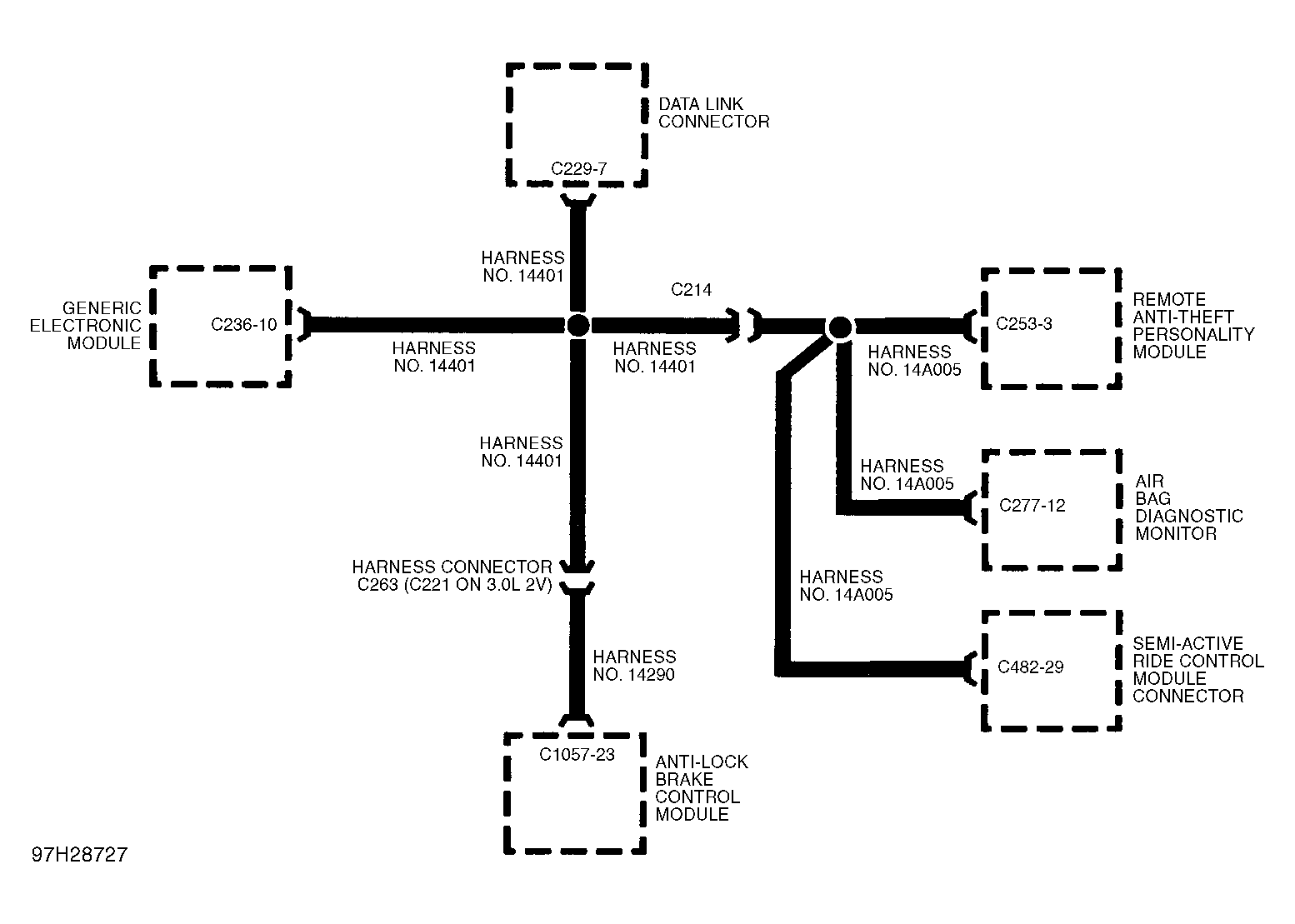 Determine if vehicle is equipped with Semi-Active Ride Control (SARC) module. SARC module is located behind rear seat on right side of luggage compartment. If vehicle is equipped with SARC module, go to next step. If vehicle is not equipped SARC module, repair circuit No. 70 (Light Blue/White wire) in harness No. 14A005. Repeat DATA LINK DIAGNOSTICS