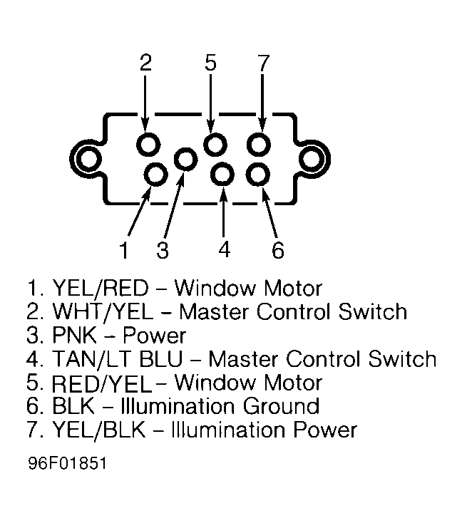 1. With window switch in neutral position, there should be continuity between pins No. 1 (Yellow/Red wire) and No.3 (Pink wire), No. 2 (White/Yellow wire) and No. 5 (Red/Yellow wire), and between No. 4 (Tan/Light Blue wire) and No. 6 (Black wire). See Fig 1 .