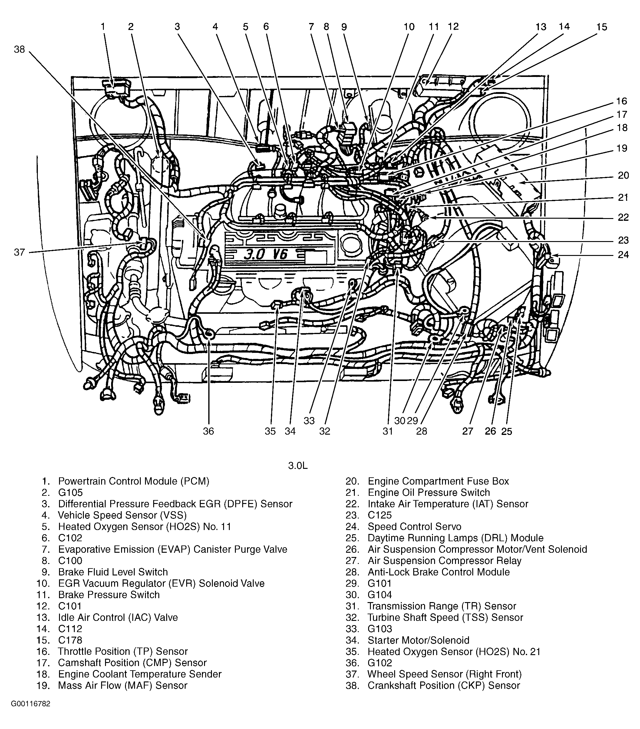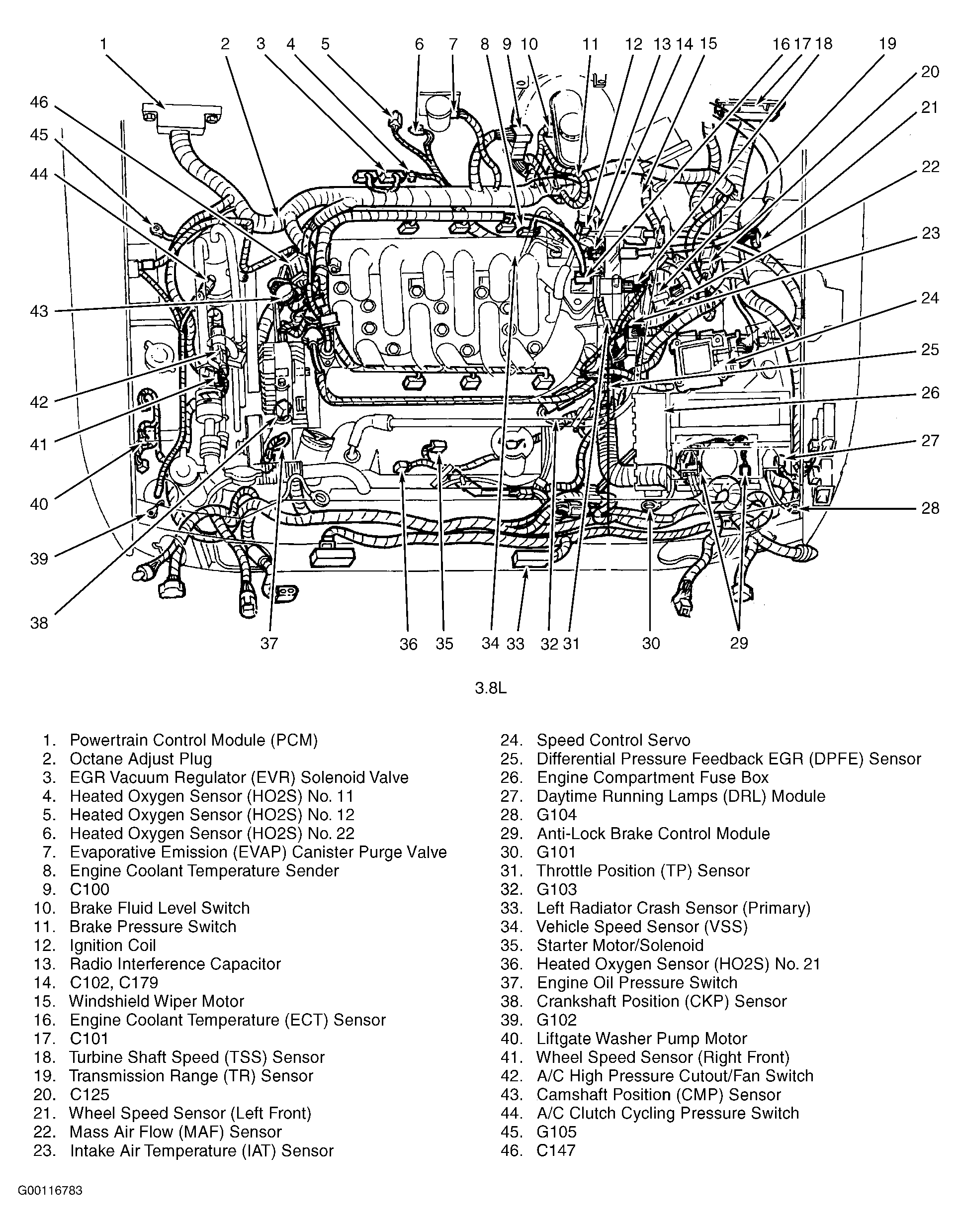 | Daytime Running Lights (DRL) Module (3.8L) | At left front of engine compartment. See Figure. |