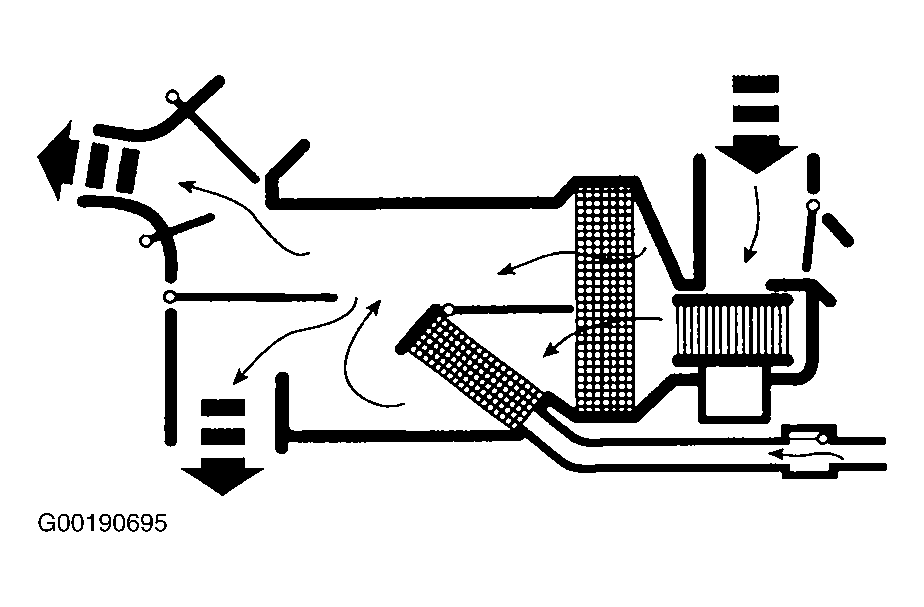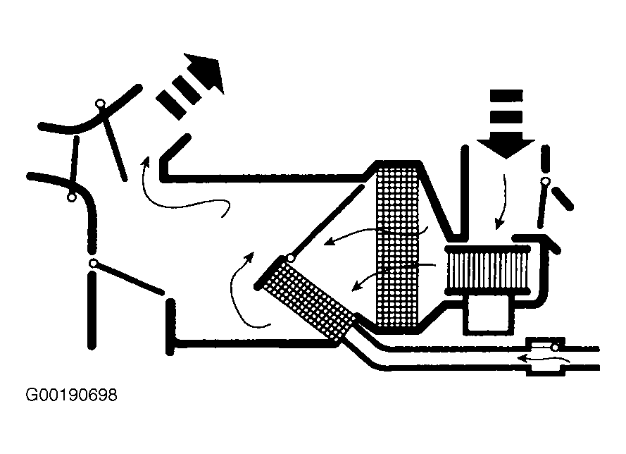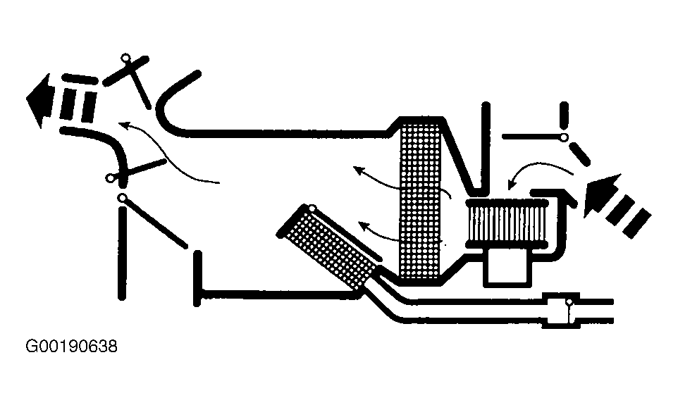 When function selector knob is in maximum A/C position, air inlet blend door is at full vacuum, closing off outside air and allowing only recirculated air. See Fig 1. Defrost blend door is at full vacuum while footwell blend door is at no vacuum, closing both doors. Vent/register blend door is at partial vacuum, directing airflow to driver side, passenger side and center registers. Temperature control is usually set for maximum cold but may be heated if selected. Air is picked up at recirculation opening by blower motor. With temperature control set for maximum cold, air flows across evaporator core, diverting past heater core and then directed into passenger compartment through driver side, passenger side and center registers. Compressor is enabled when MAX A/C is selected. Blower motor is on.