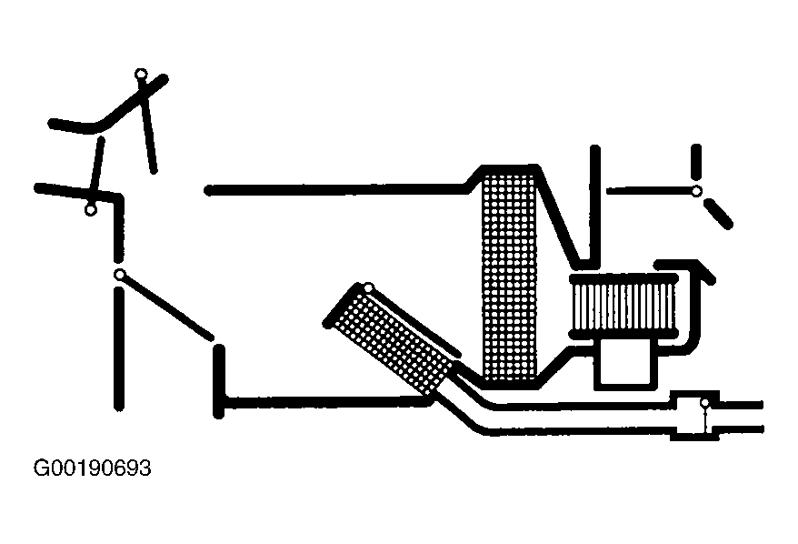 When function selector knob is in floor/defrost position, air inlet blend door is in no vacuum position blocking recirculation air and allowing outside air. See Fig 7. Footwell blend door is at full vacuum allowing air to flow through footwell ducts. Defrost blend door is in no vacuum position, allowing airflow to both windshield defroster hose nozzle and side window demister hose nozzle ducts. Vent/register blend door is in no vacuum position. Compressor is enabled when FLOOR/DEFROST is selected to dehumidify air and reduce windshield fogging. Blower motor is on.