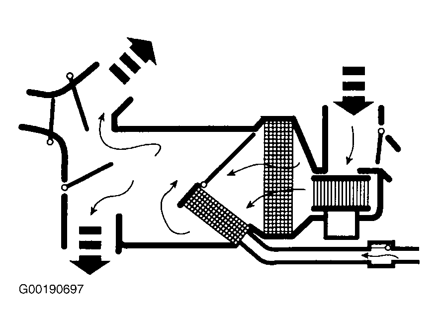 When function selector knob is in off position, air inlet blend door is at full vacuum, closing off outside air and allowing only recirculated air. See Fig 4. Vent/register blend door is at no vacuum and defrost, footwell and blend airflow doors are at no vacuum, closing off passages to driver, passenger and center registers. Blower motor and compressor are off.