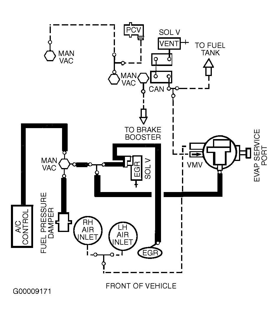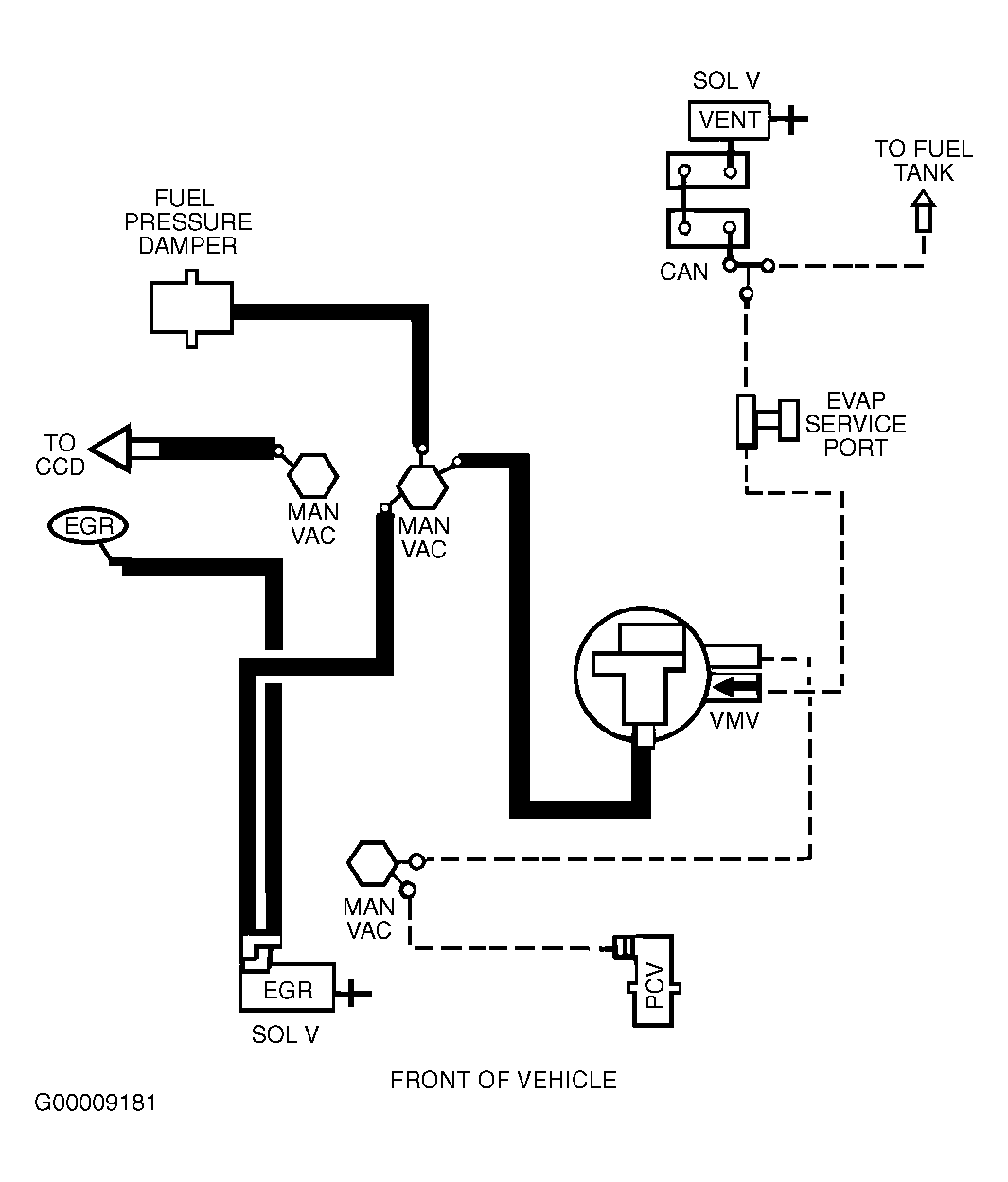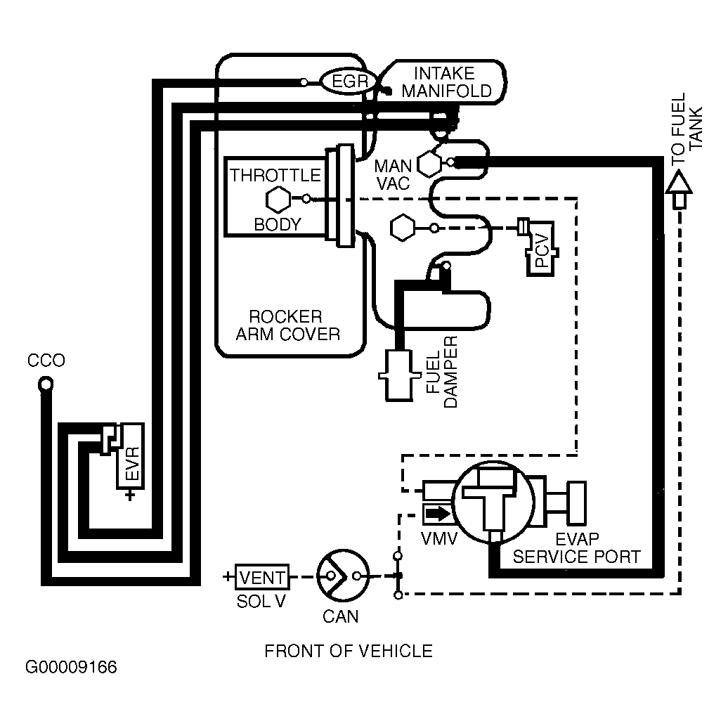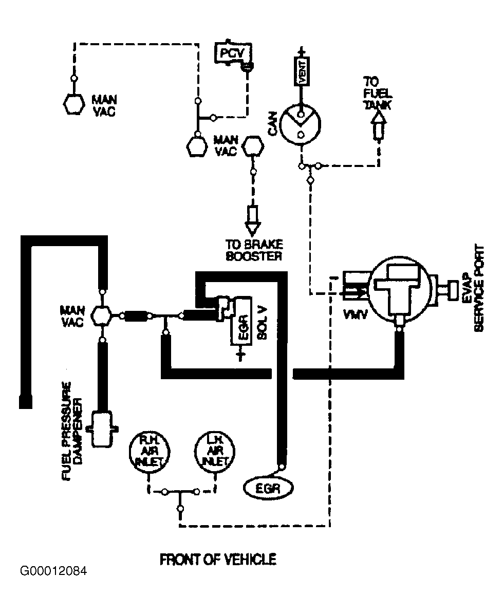 This article contains underhood schematics of vacuum hose routing. Use these vacuum diagrams during the visual inspection performed in the appropriate BASIC DIAGNOSTIC PROCEDURES article. This will assist in identifying improperly routed vacuum hoses, which may cause driveability and/or computer-indicated malfunctions. To properly identify calibration code, catch code must be identified. The catch code is the 4 alpha/numeric characters located in parenthesis at the end of the calibration code. Example; 9-EQA-BBD 9 (BAX3). The BAX3 is the catch code. The catch code tag is attached to the powertrain control module connector. See POWERTRAIN CONTROL MODULE LOCATION table. On some models, the catch code tag may also be located on the "A" pillar or inner fender.
