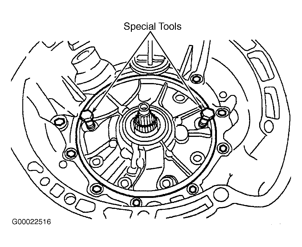 - Ensure outside of transaxle is thoroughly clean. Mount transaxle on stand. Remove OSS sensor, TSS sensor and TR sensor. Drain torque converter. Remove torque converter using Special Tool (307-091). Remove oil pump using Special Tools (307-289). See Fig 1
