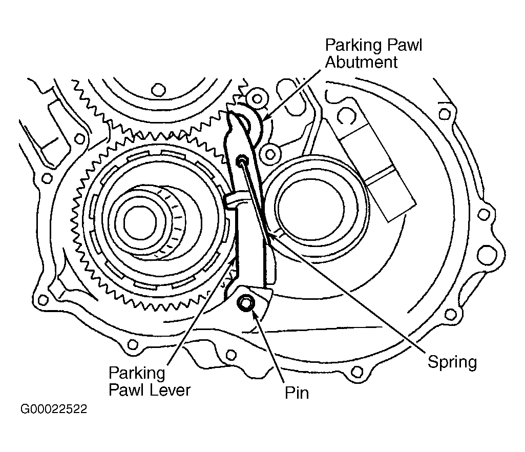 - Remove bolts and separate converter housing from transaxle case. Remove differential assembly. Remove 2 bolts and remove parking pawl assembly cover. Unclip parking pawl abutment spring. Remove pin, lever and parking pawl abutment. Remove spring. See Fig 3