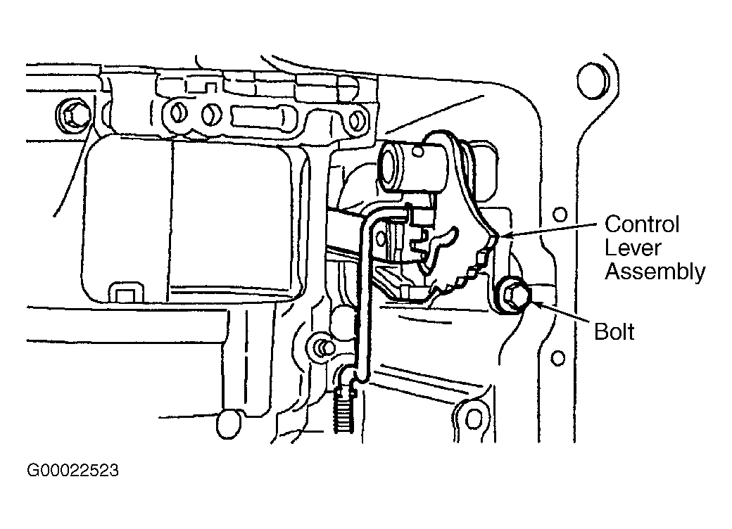 - Remove manual lever shaft pin and remove manual lever shaft. Remove 2 "O" rings from manual lever shaft. Remove control lever assembly bolt and remove control lever assembly. See Fig 2