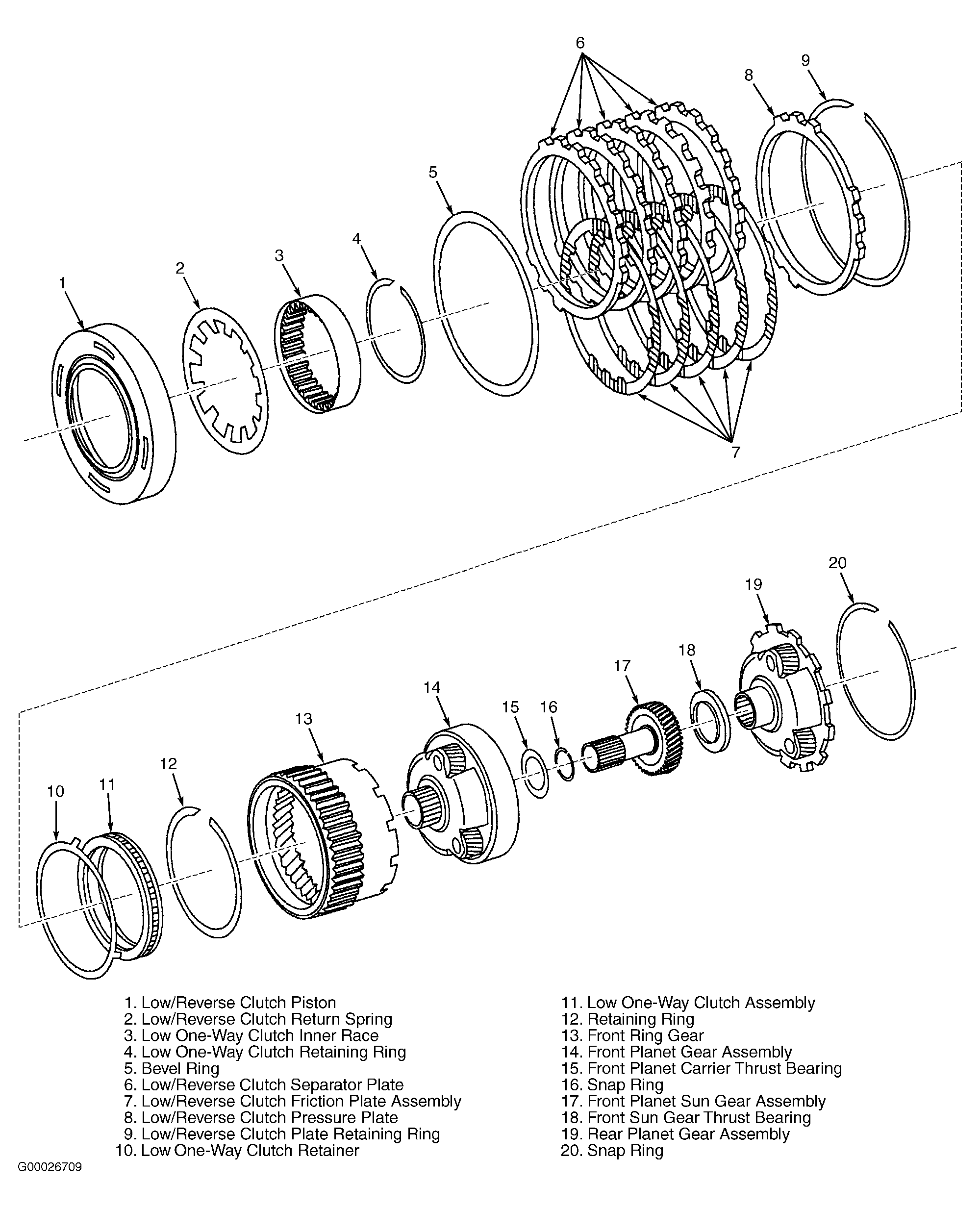 . Remove planet gear assembly. Remove low/reverse clutch plate retaining ring, pressure plate, clutch plates and bevel ring. See Figure