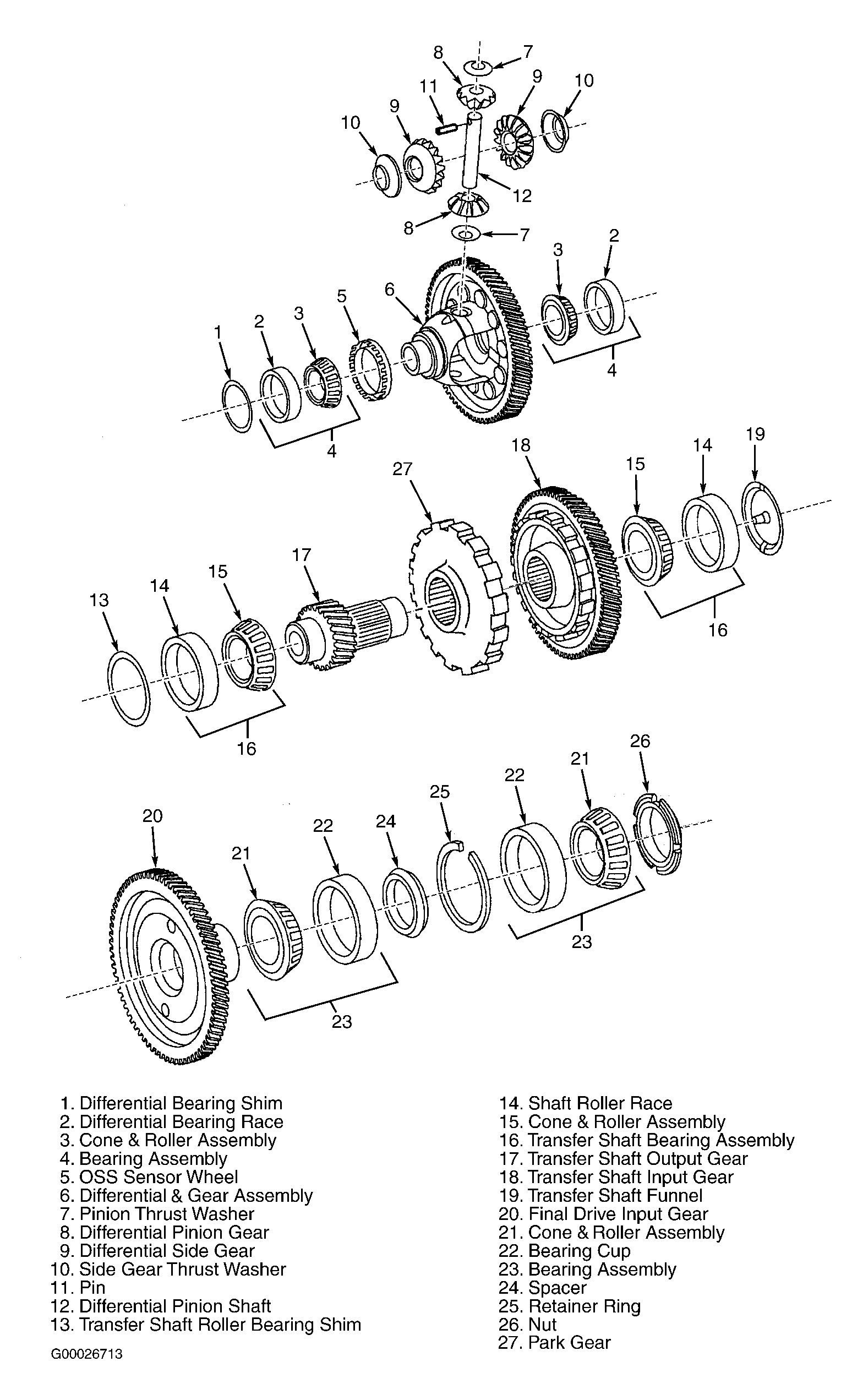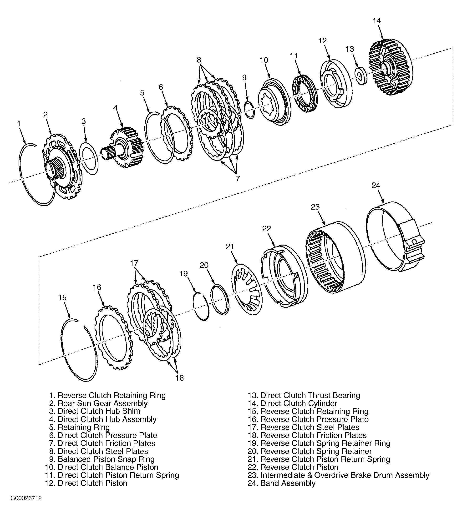 - Remove forward clutch hub, thrust washer and forward clutch assembly. Rotate transaxle on stand 180 degrees. Remove transaxle end cover. Remove direct clutch hub bearing shim. Remove end cover seals and end cover to case seals. Remove direct clutch cylinder thrust bearing. See Figure