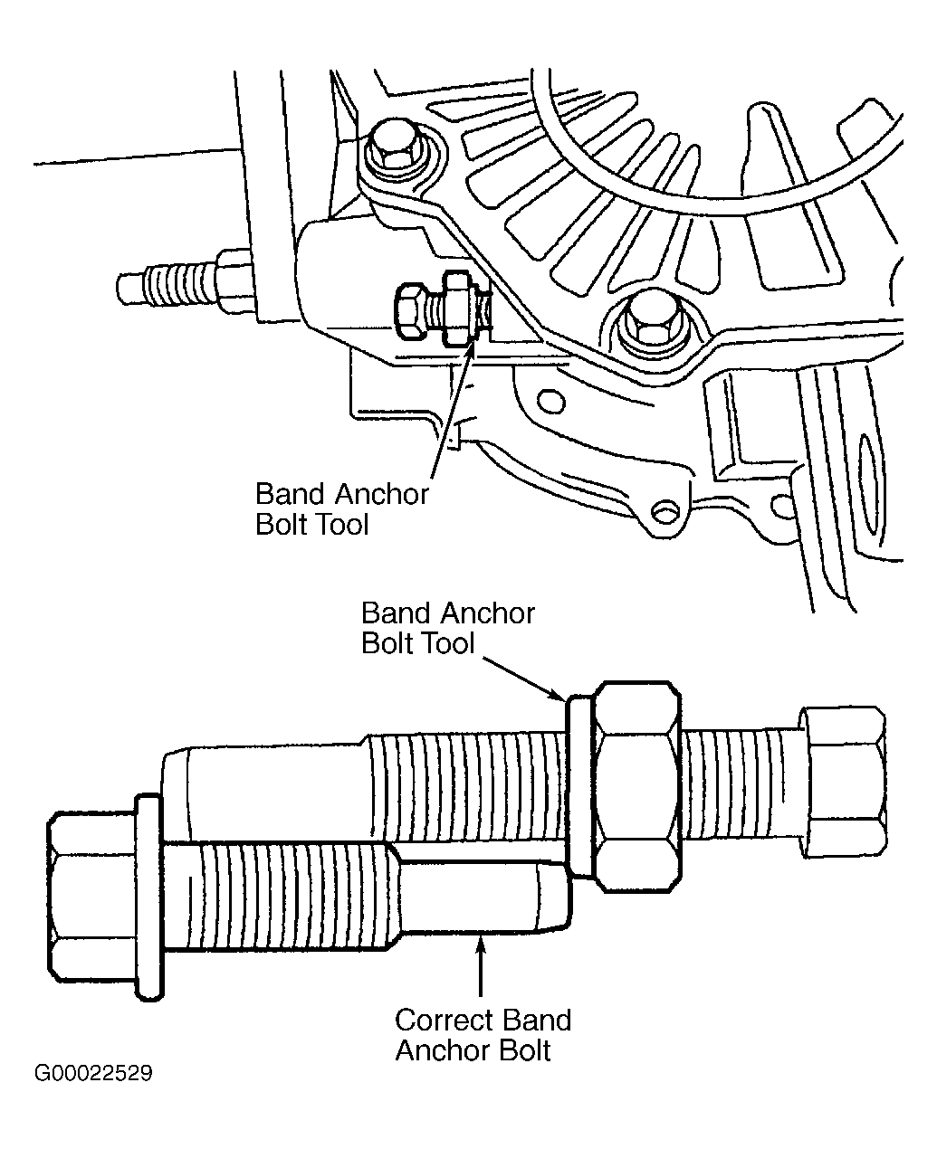 - Install correct direct clutch hub shim. Apply bead .039" (1.0 mm) thick of Ultra Silicon Sealant (or equivalent) to transaxle end cover. Install transaxle end cover and bolts, and tighten bolts to specification. See TORQUE SPECIFICATIONS . Using Band Anchor Bolt Tool (307-415 and 307-416), tighten intermediate/overdrive band to 44 INCH lbs. (5.0 N.m), then back out bolt 3 1/2 turns. Holding bolt tool, lightly seat nut against transaxle case. Remove bolt tool without changing nut position. Using bolt tool, select an intermediate/overdrive band anchor bolt that measures from end of bolt to face of nut. See Fig 3 . Install correct intermediate/overdrive band anchor bolt.