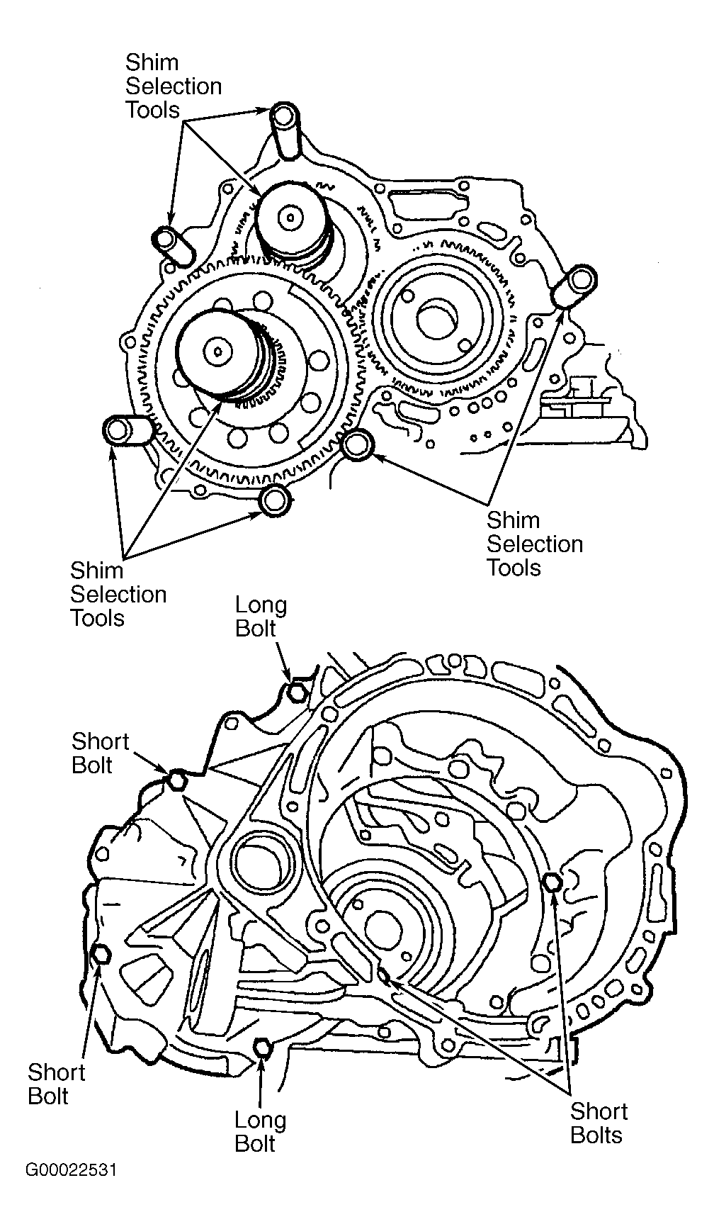 - Position Shim Selection Set (308-164) and Bearing Shim Gauge (307-417). Position converter housing and install long bolts to seat case cover flat. Install short bolts. See Fig 1 . Tighten all bolts to 44 INCH lbs. (5.0 Nm). Remove bolts and remove converter housing.