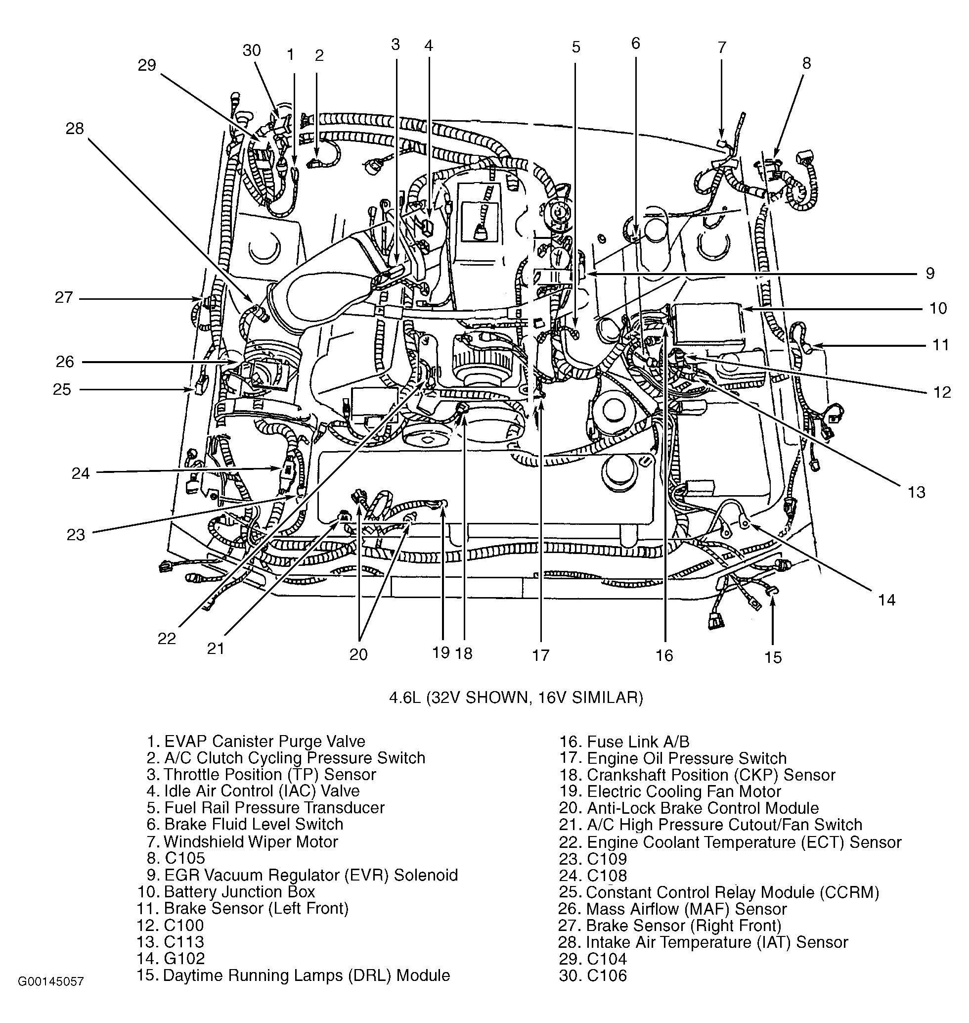 | Daytime Running Lamps (DRL) Module (4.6L) | In left front corner of engine compartment, below horns. See Figure. |