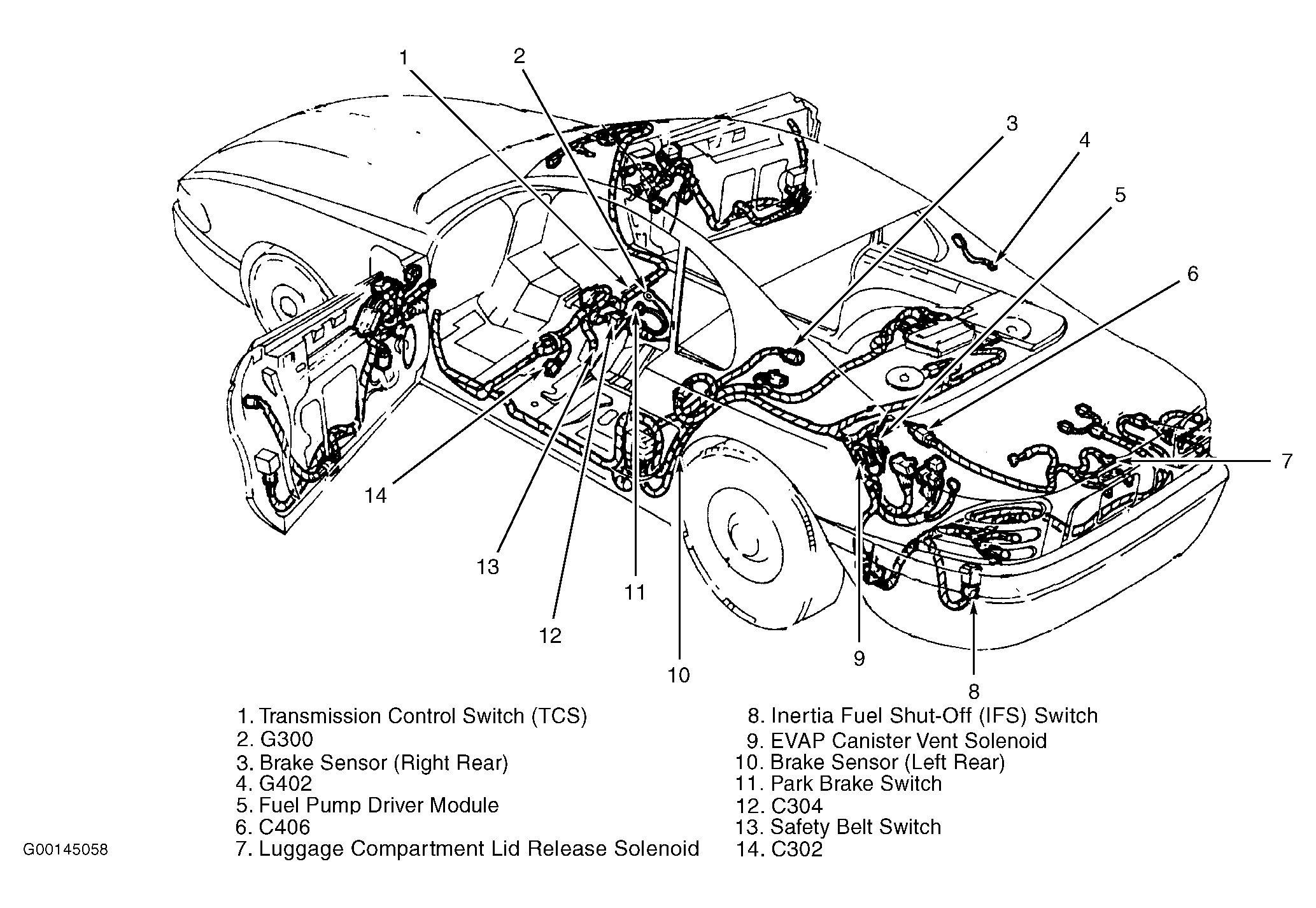 | Fuel Pump Driver Module | Underside of luggage compartment. See Figure. |