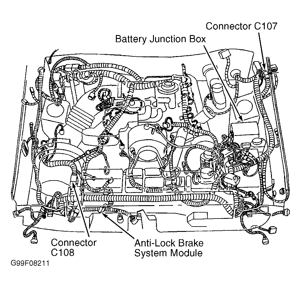 - Turn ignition switch to LOCK position. Disconnect in-line harness connector C108. See Figure . Turn ignition switch to RUN position. Measure voltage between terminals No. 2 (Tan/Orange wire) and No. 4 (Black wire) at DLC. Then, measure voltage between terminals No. 2 (Tan/Orange wire) and No. 16 (Light Green/Red wire) at DLC. Also, measure voltage between terminals No. 4 (Black wire) and No. 10 (Pink/Light Blue wire) at DLC. Then, measure voltage between terminals No. 10 (Pink/Light Blue wire) and No. 16 (Light Green/Red wire) at DLC. If any measurement indicates zero volts, go to step 8 . If all measurements indicate voltage, repair short to voltage or ground in appropriate circuit between in-line harness connector C108 and ABS control module.
