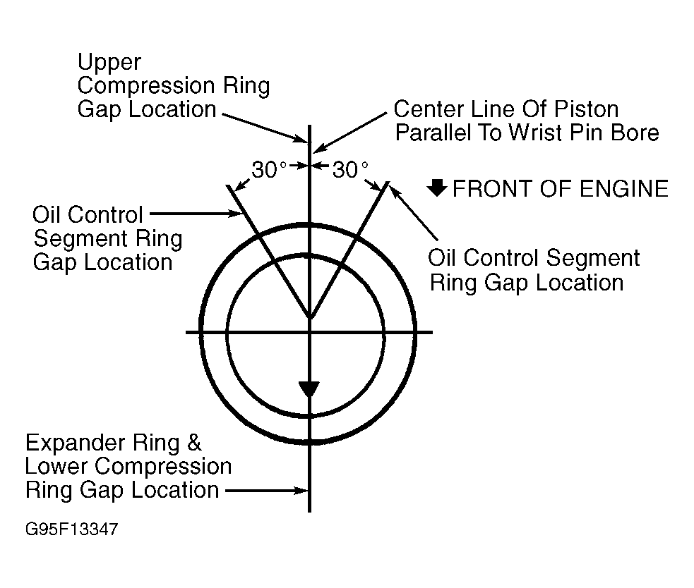 Inspect piston rings for abnormal wear or breakage. Ensure ring end gap and side clearance are within specification. See PISTONS, PINS & RINGS table under ENGINE SPECIFICATIONS. Position piston rings at designated areas. See Figure.