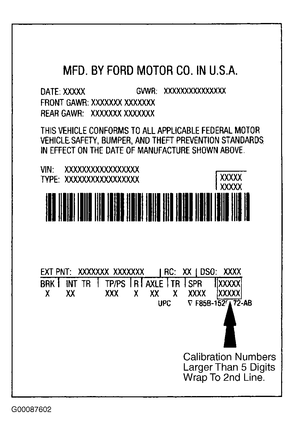 Vacuum diagrams are identified by calibration code. Use the Vehicle Certification Label to identify calibration. Powertrain calibration information is located at lower right corner of Vehicle Certification Label. Powertrain calibration information is limited to a maximum of 5 characters per line on the Vehicle Certification Label. Calibration numbers consisting of more than 5 characters will wrap to the second line of the Vehicle Certification Label. See Fig 1 . As of 1999, Ford Motor Co. is no longer printing revision level on label. Revision information can be located by contacting an authorized Ford dealer. Vehicle Certification Label is attached to left door or left door pillar.