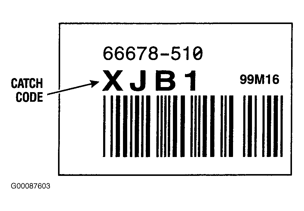 Beginning in 2000, a 4-digit alpha-numeric code, referred to as Calibration Catch Code, appears in parentheses at the end of the calibration code. Example; 9-EQA-BBD 9 (BAX3). The BAX3 in this example is the Calibration Catch Code. This Calibration Catch Code information is attached with a tag to the Powertrain Control Module (PCM) connector and, on some models, the Calibration Catch Code tag may also be located on the "A" pillar or inner fender. This Calibration Catch Code is needed to determine calibration number. See Fig 2 . For PCM location, see POWERTRAIN CONTROL MODULE LOCATION  table.