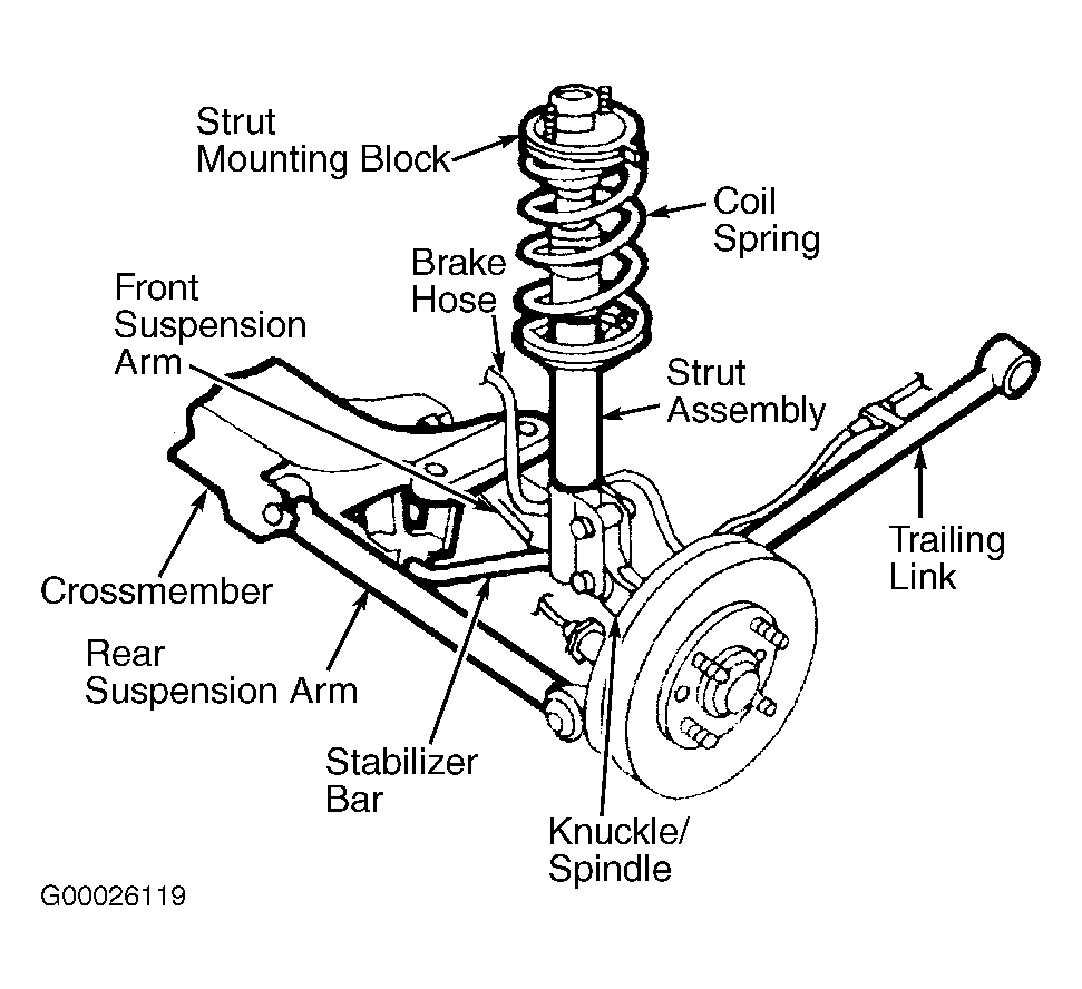 Rear suspension consists of a double-acting strut assembly with coil springs. See Fig 1 . Rear wheels and brake drums or disc brake rotors are supported by a sealed roller bearing hub assembly. A staked nut retains bearing and hub assembly on spindle.