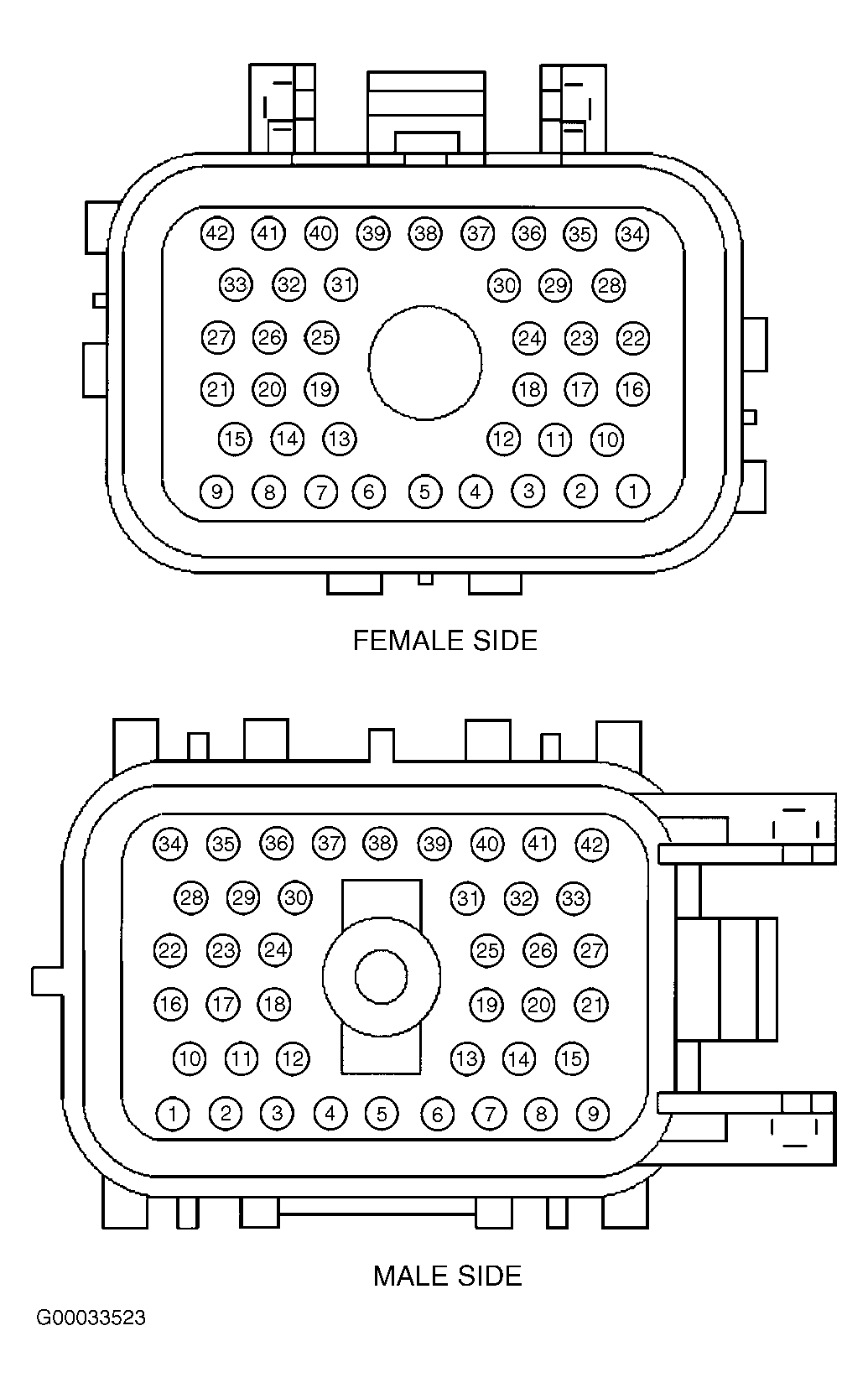 - Disconnect and inspect both halves of Gray bulkhead 42-pin harness connector C115, located at left rear corner of engine compartment. See Figure. Inspect connector for physical damage, bent terminals or corrosion. If connector is okay, go to next step. If connector is damaged, repair connector as necessary and recheck system operation.