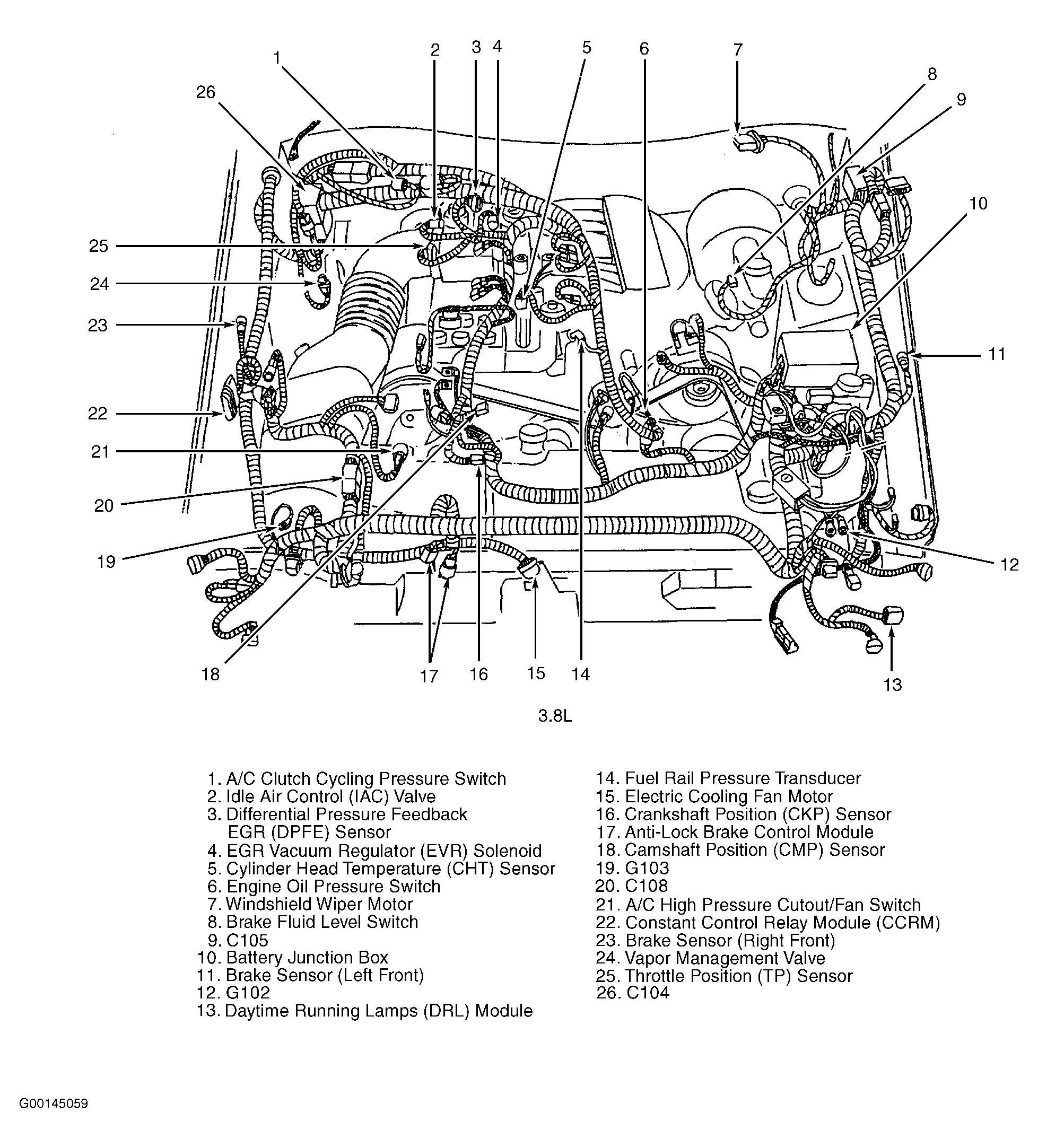 | Daytime Running Lamps (DRL) Module (3.8L) | In left front corner of engine compartment, below horns. See Figure. |