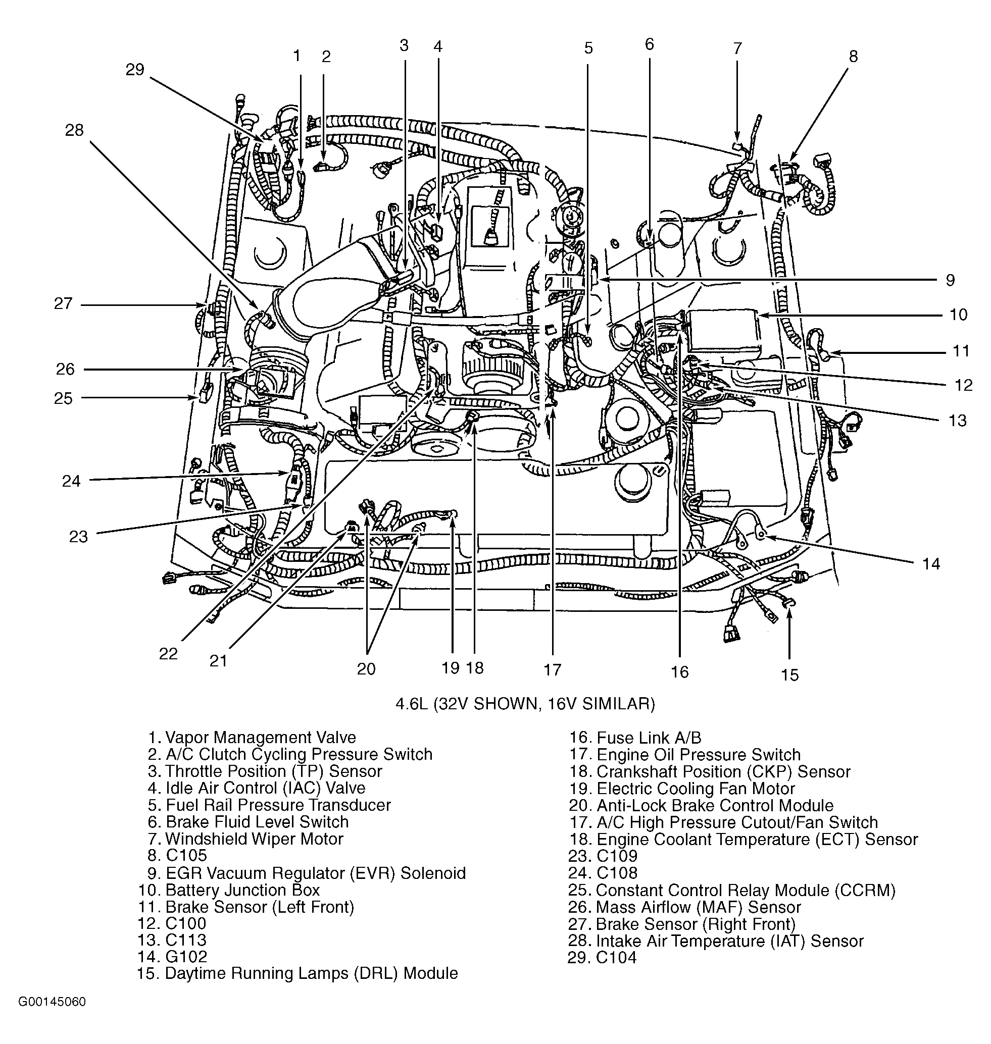 | Daytime Running Lamps (DRL) Module (4.6L) | In left front corner of engine compartment, below horns. See Figure. |