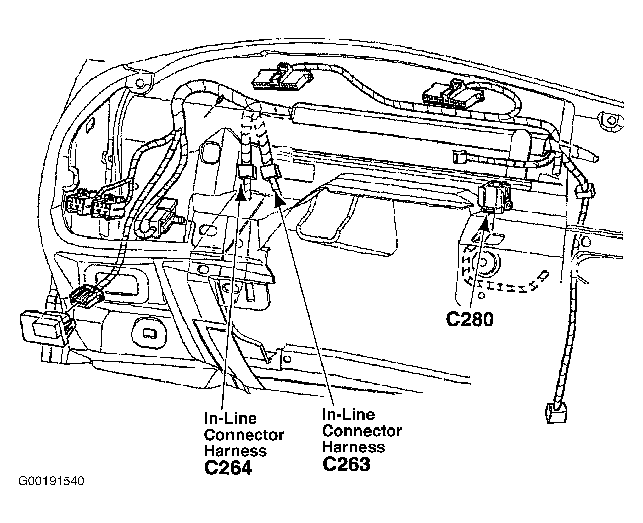 - Turn ignition switch to LOCK position. Disconnect 42-pin in-line harness connector C264, located behind left side of instrument panel. See Figure. Turn ignition switch to RUN position. Measure voltage between DLC terminals No. 2 (Tan/Orange wire) and No. 4 (Black wire), No. 2 (Tan/Orange wire) and No. 16 (Light Blue/White wire), No. 4 (Black wire) and No. 10 (Pink/Light Blue wire), and No. 10 (Pink/Light Blue wire) and No. 16 (Light Blue/White wire). See Figure. SeeWIRING DIAGRAMS . If voltage is present at any measurement, repair short in appropriate circuit between in-line harness connectors C264 and C219. If voltage is not present at all measurements, repair short in appropriate circuit between in-line harness connectors C140 and C264. After repair, test system for normal operation.