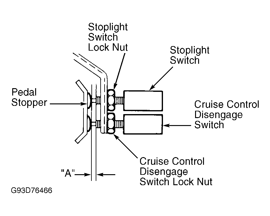 Check the brake pedal free height. See appropriate DISC & DRUM article in BRAKES. Disconnect the negative battery cable. Disconnect the Brake Pedal Position (BPP) switch harness connector. Loosen the lock nut. Measure distance from brake pedal stopper to threaded end of stoplight switch. Switch height "A" should be 0.012-0.039" (0.30-1.00 mm). See Fig 1. Tighten the lock nut. Reconnect the BPP switch harness connector. Reconnect the negative battery cable.