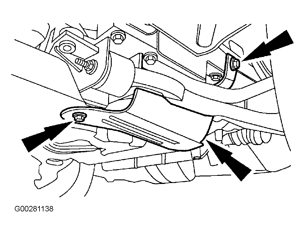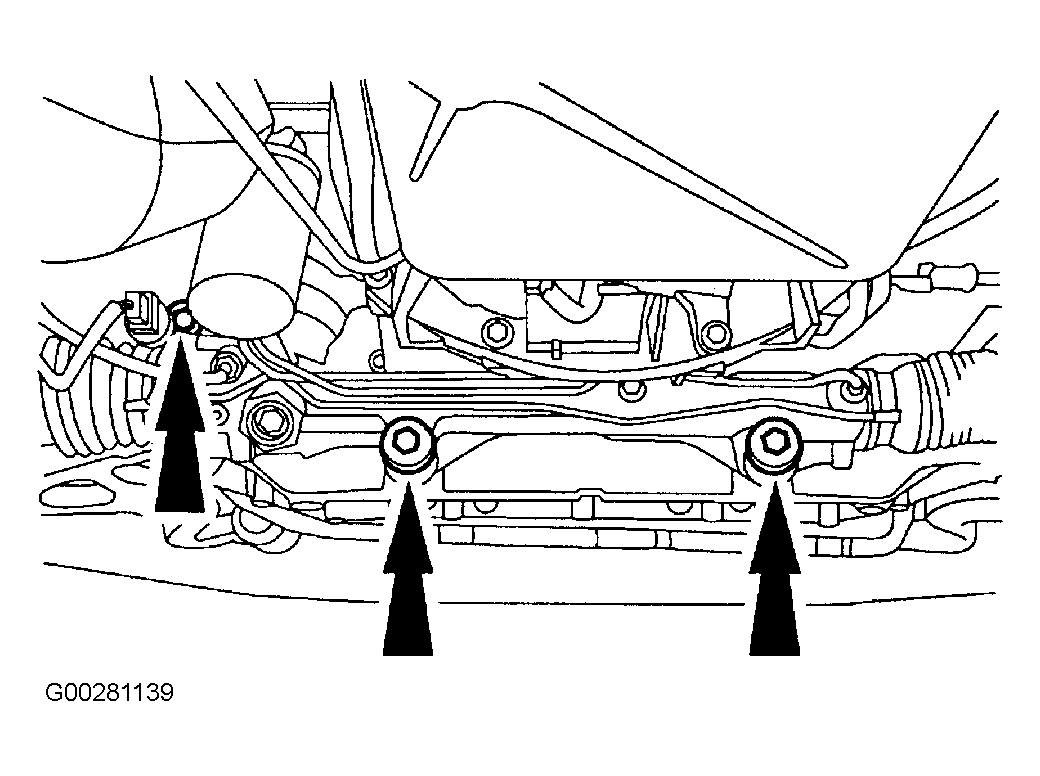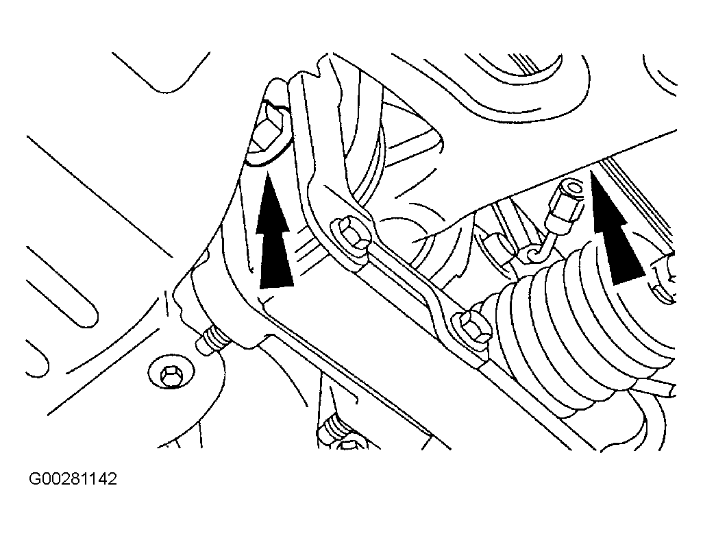 1. Remove two bolts, one pushpin and the splash shield. See Fig 1 . Remove and discard the pinch bolt and disconnect the steering shaft, if necessary. Remove three steering gear lock nuts and bolts. See Fig 2 . Discard the lock nuts.